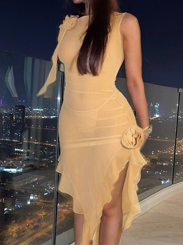 Description: Head to the date night parties. or some special occasions. this tank-styled dress must be a perfect one. Made from stretchy sheer mesh fabric. shaped to a bodycon silhouette. features 3d florals embellished. with an asymmetrical hem. and has extended ruffle straps design.