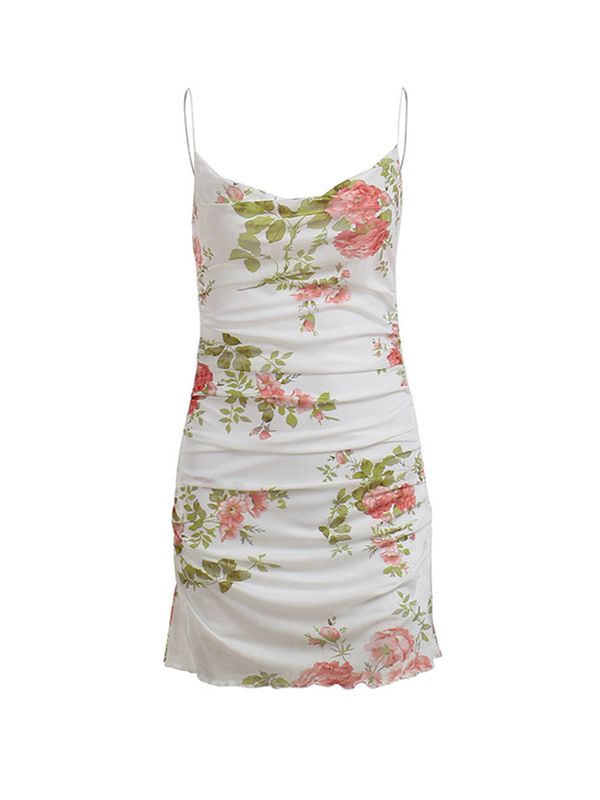 Description: With floral-inspired print. this cute dress made from mesh fabric. features ultra-thin shoulder straps design. with ruched and lettuce edge detailing.