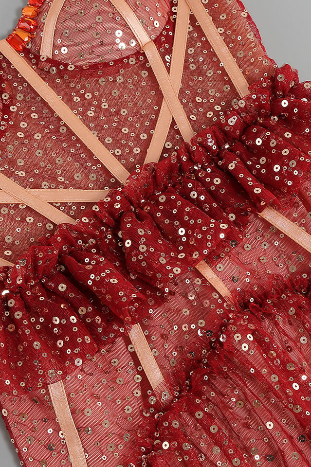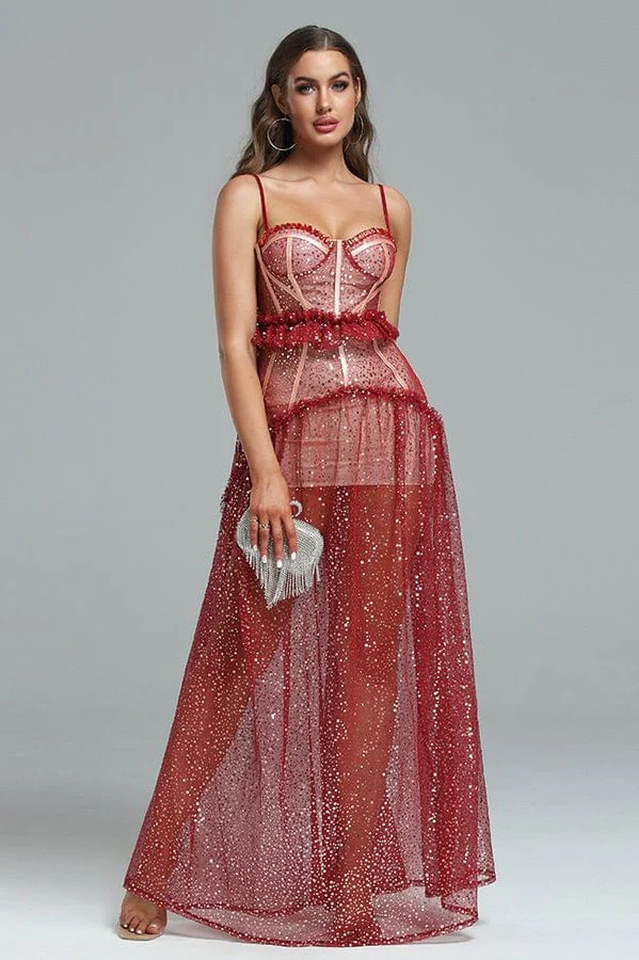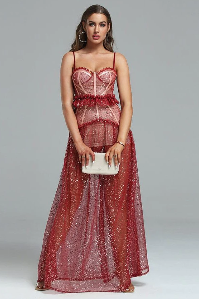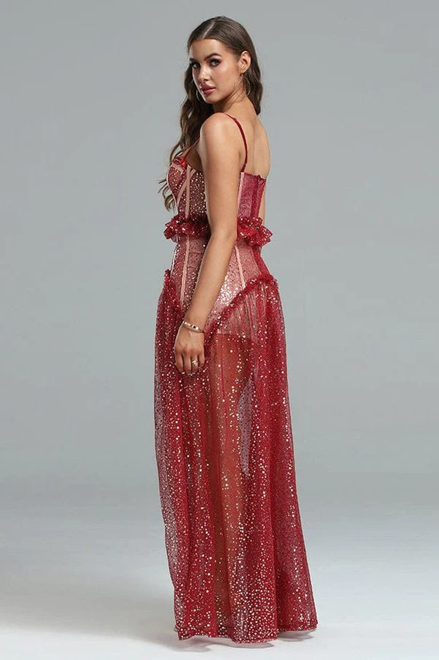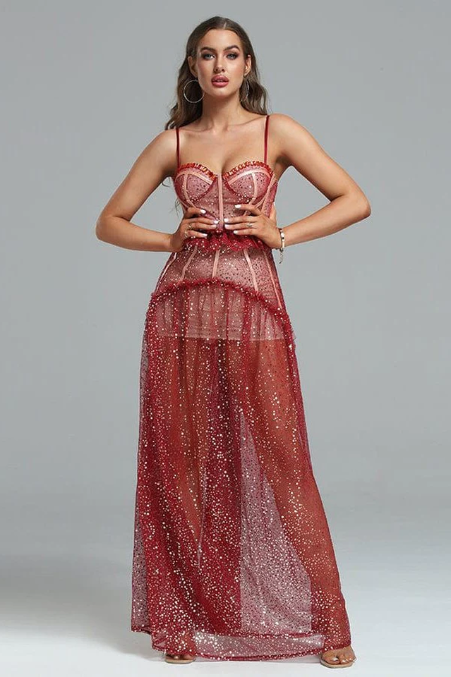 This Barrett Sequined Mesh & Lace Maxi Dress is the perfect blend of sophistication and style. Its exquisite strappy sequins mesh & lace will surely turn heads at special occasions. while its maxi length adds an elegant touch. A must-have for any fashionista.