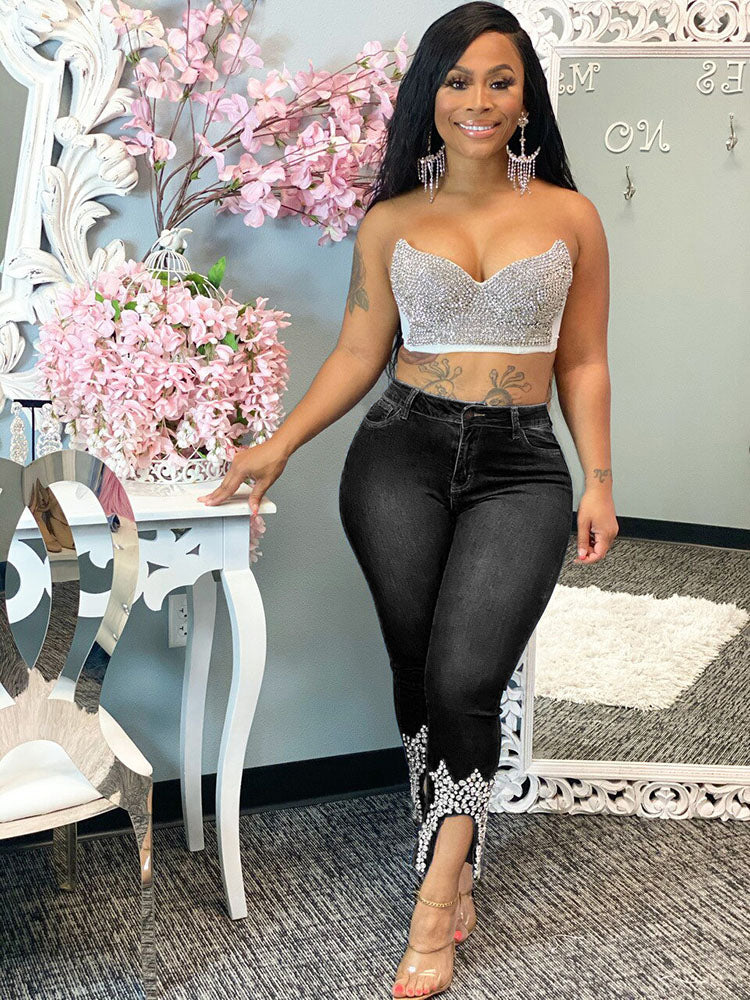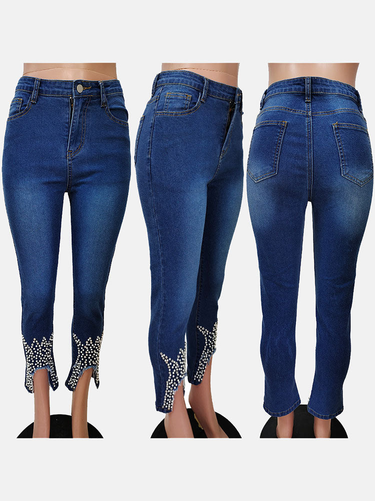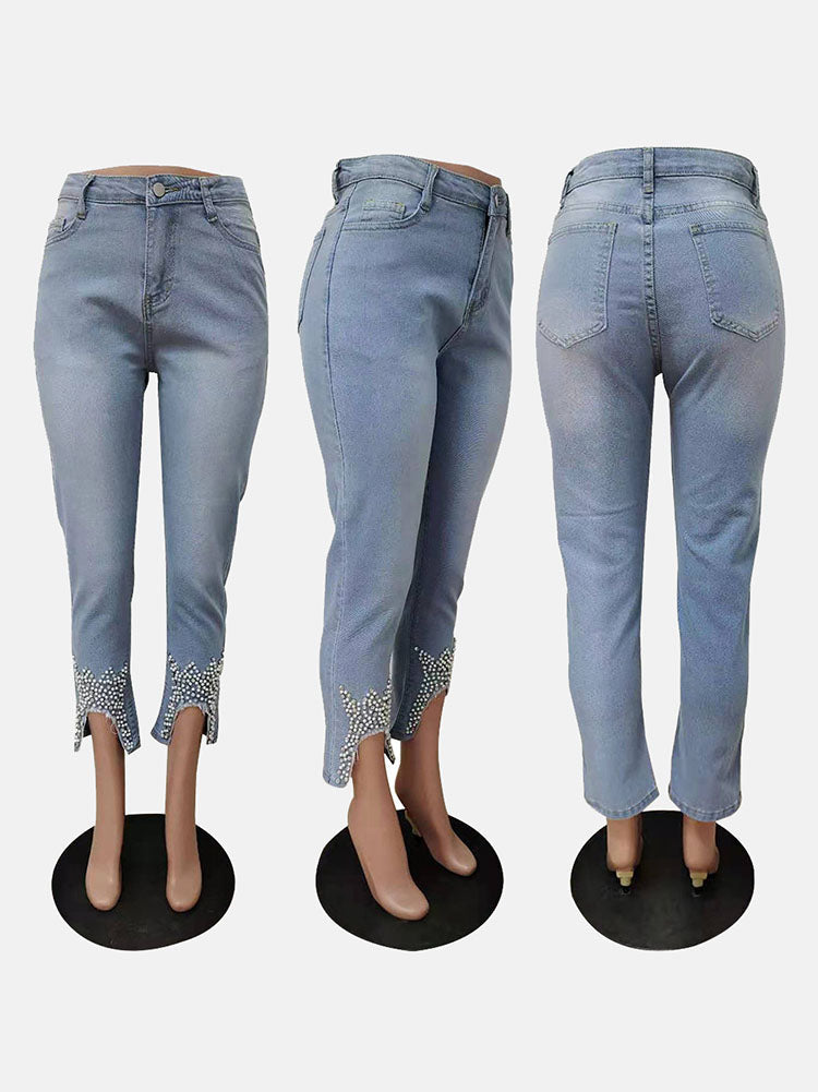 Beading Mid Waist Skinny Jeans