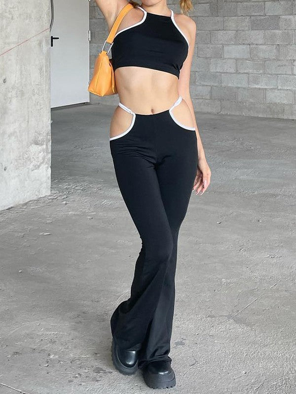 Description: Save your time when going-out with these effortlessly co-ord sets. we're obsessed. They have included a crop cami top features contrast trim design. With matching flare leg pants. features a stretchy cutout waist style. and has contrast trim details.