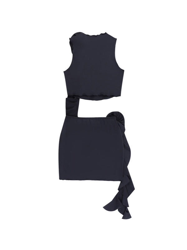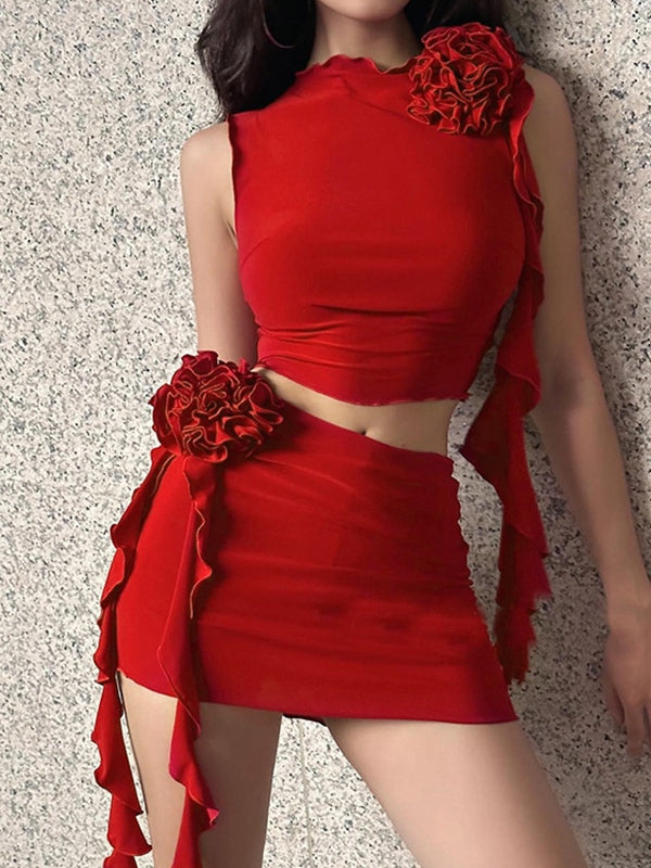 Description: Dimension flower details are so trendy this season. it's cute and fashionable. These two-piece have included a cropped tank top & a mini skirt set. It features 3d floral embellished with frill straps design. and has lettuce edge details.