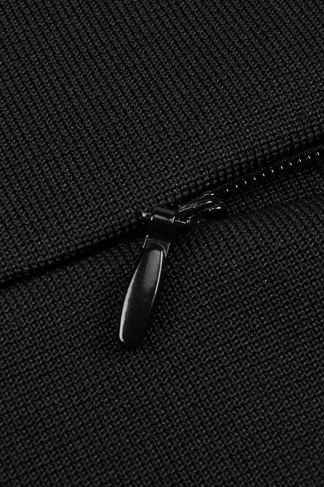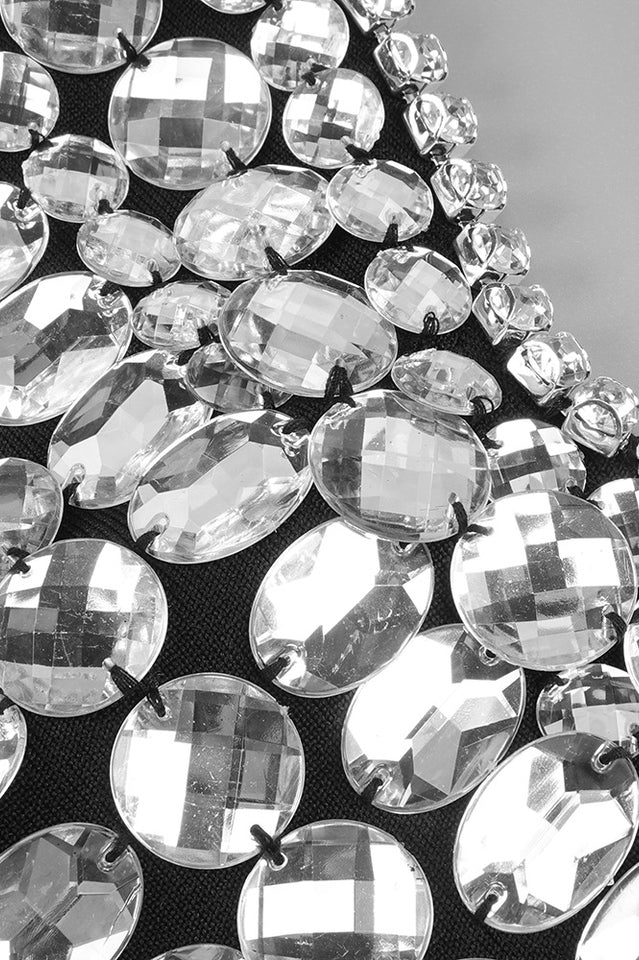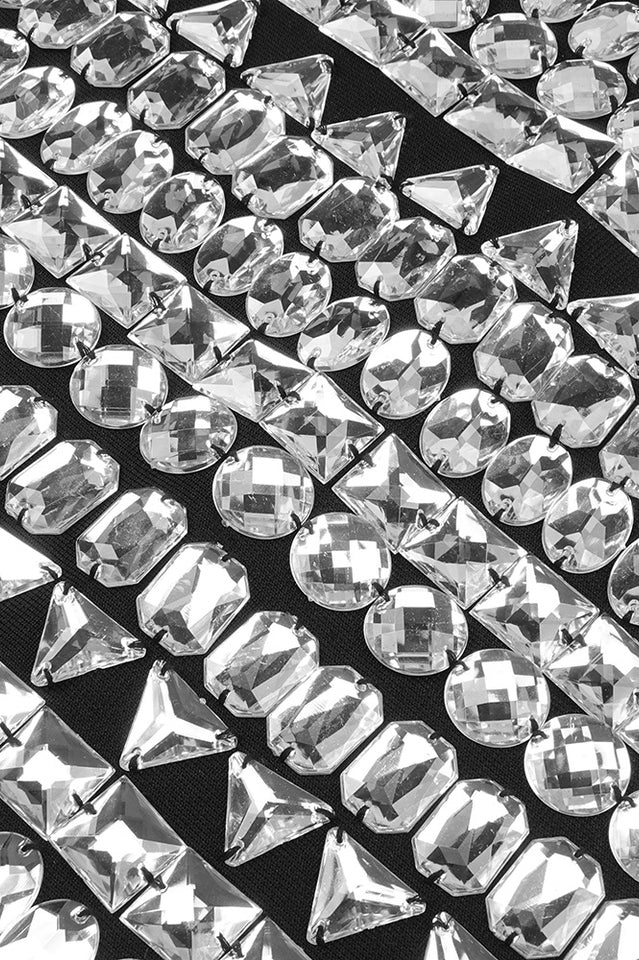 Make a big. bold entrance like a style icon in the Brisbane Rhinestones Embellished Mini Dress! Soft medium-weight bandage boasts dramatic beaded jewel accents at the front as it shapes this fabulous little black dress that falls from adjustable straps into a sweetheart neckline. Princess-seamed bodice atop a high waist and a flirty. bodycon mini skirt. Matching gloves adds to the look. Hidden back zipper/clasp.