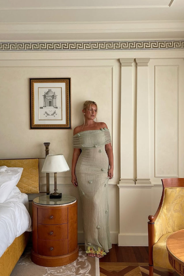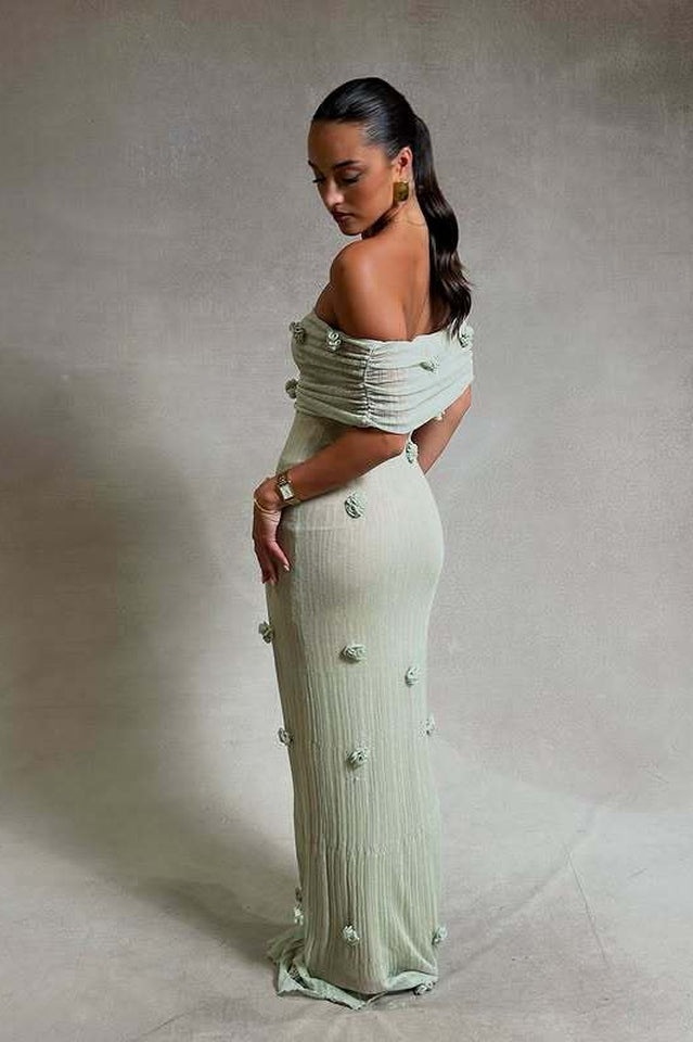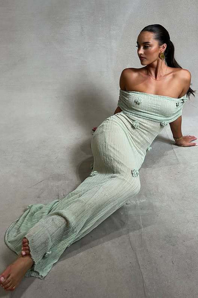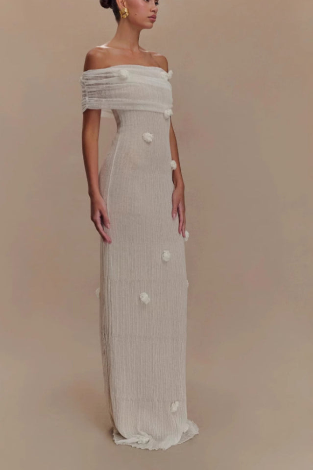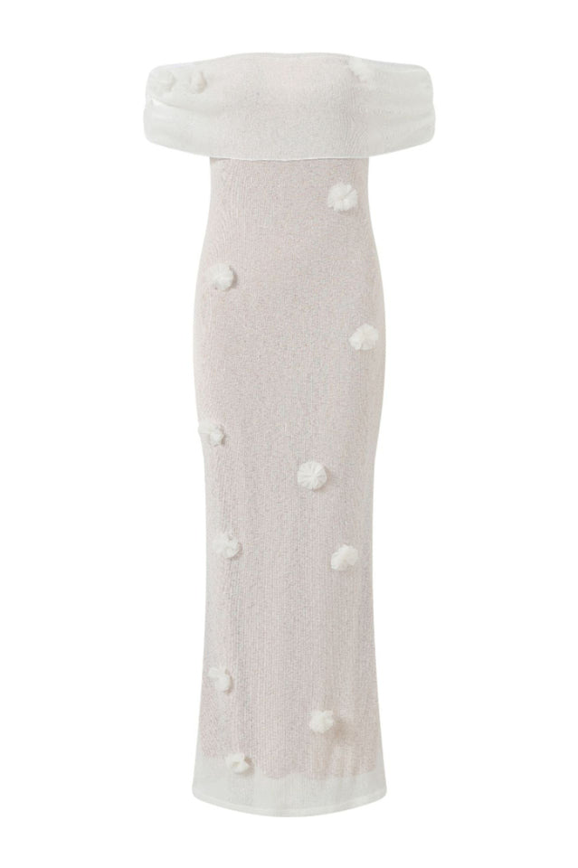 This Brooke Off Shoulder Flower Knit Maxi Dress is made from high-quality and comfortable fabric. with an off-shoulder design and beautiful flower knit pattern. Perfect for a casual or formal occasion. this dress will keep you stylish and comfortable all day. Stand out in this must-have dress!