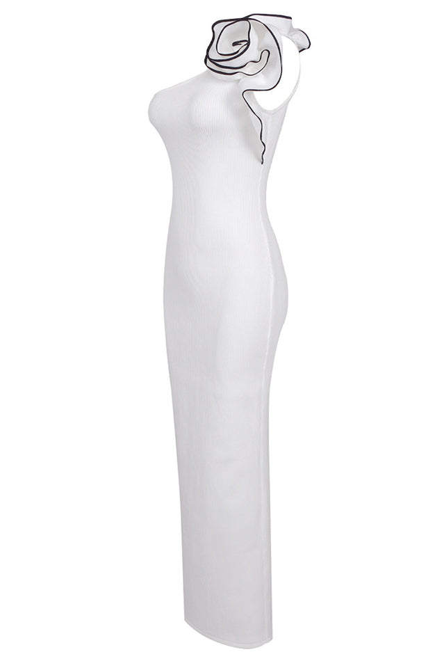 Our Calling a White Party dress will be your new go-to. Featuring ribbed thick fabric for added shape and to avoid any sheerness. The dress has stretch and includes a zip at the side with the focal point of this style being the asymmetrical cut with flower decal.