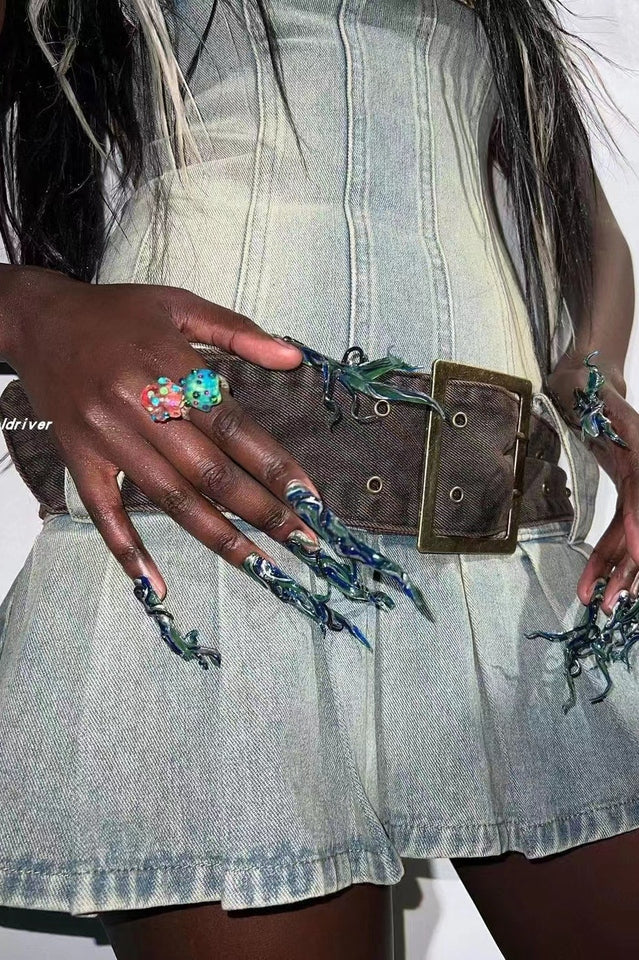The Chelsea Denim Kilt Dress features detachable belts for an adjustable fit. Crafted from heavyweight light wash blue denim in a mini length.