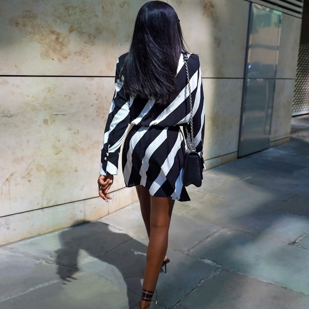 Diagonal Stripe Print Shoulder Pad Deep V Wrap Mini Dress - Black