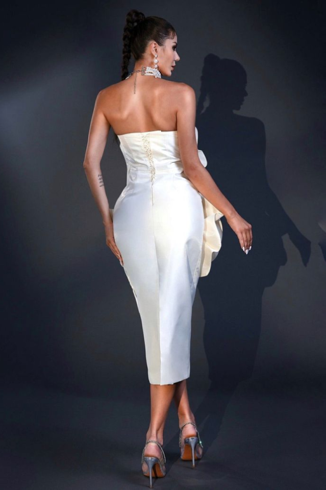 Introducing the Clair Floral Midi. This intricately crafted strapless midi dress is meticulously tailored from the finest textured ivory satin. ensuring both luxury and comfort on your special day. Adorned with a breathtaking three-dimensional floral embellishment. this voluminous piece offers a contemporary take on timeless elegance.