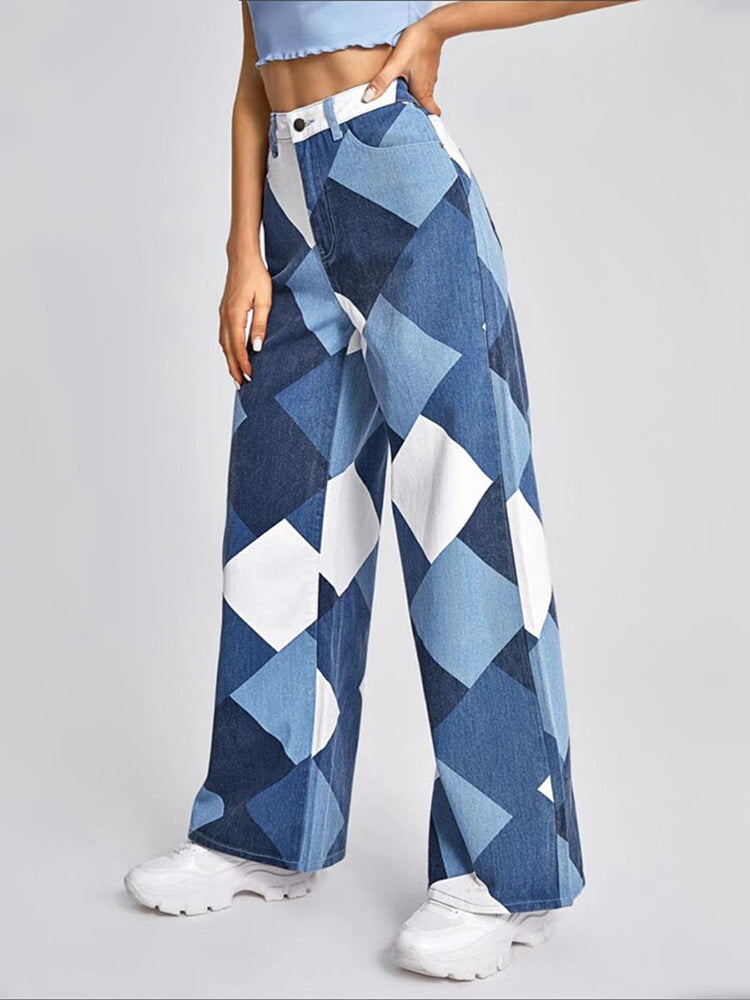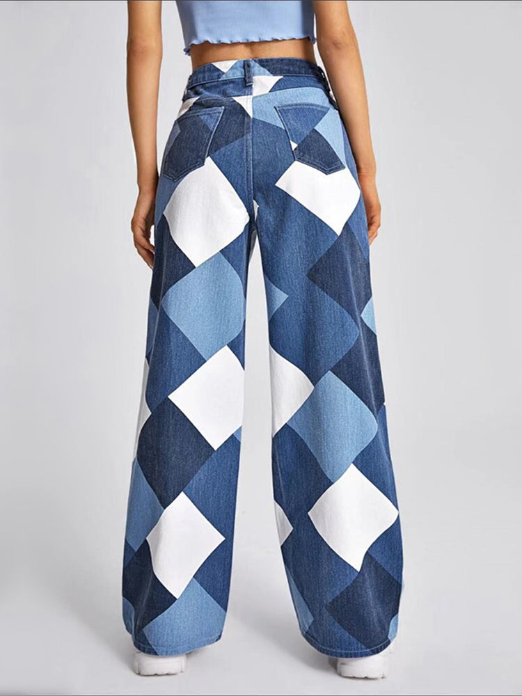 Color Block Argyle Print Wide Leg Jeans
