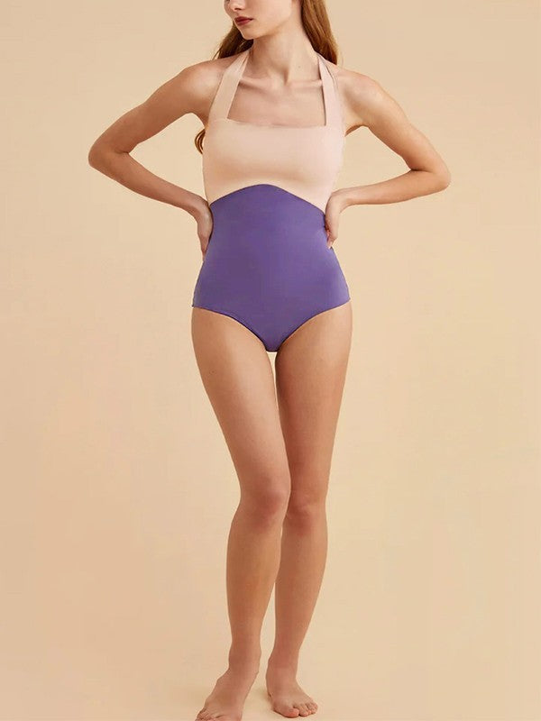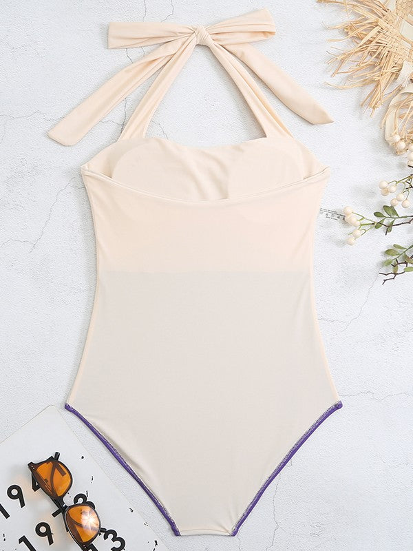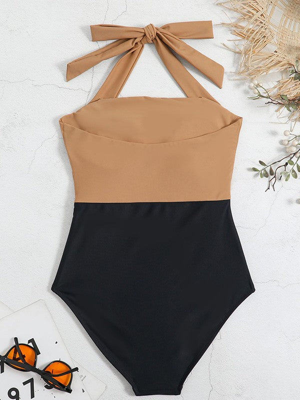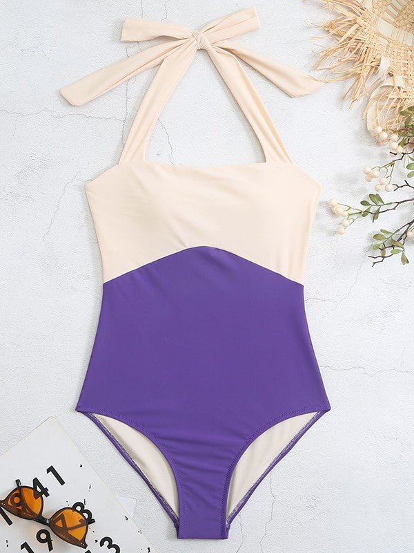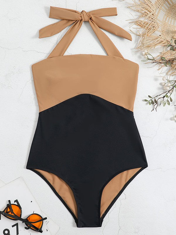 Description: Features a contrast color block panel style. with padded cups and has adjustable halter tie neck design.