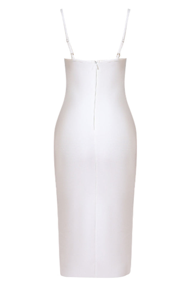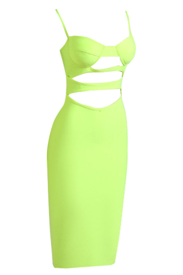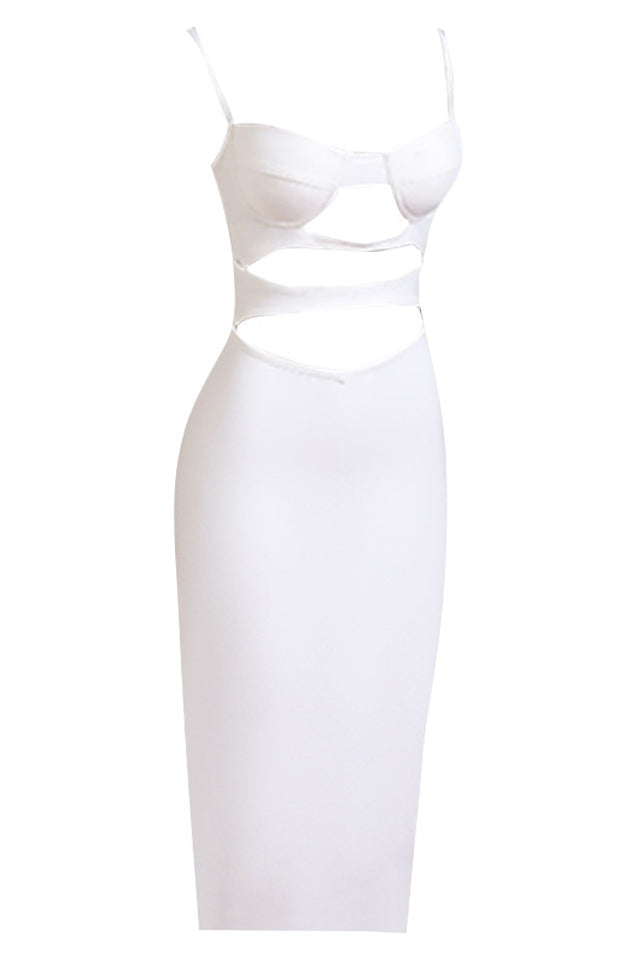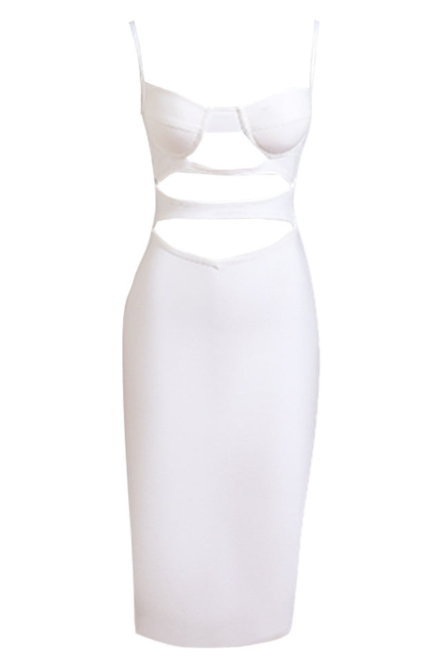 Cut to a midi length. the Constance dress is designed with thin straps. the dress also features daring underbust cut outs design. Ultra flattering with a sheath bust and waist accentuating twisted underbust with the zipper closure at the back. You can rely on the Constance dress to create a seductive evening look.