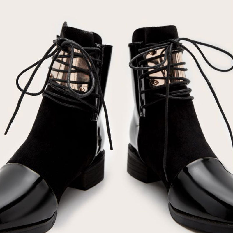 Contrast Panel Metal Trim Lace Up Ankle Boots - Black