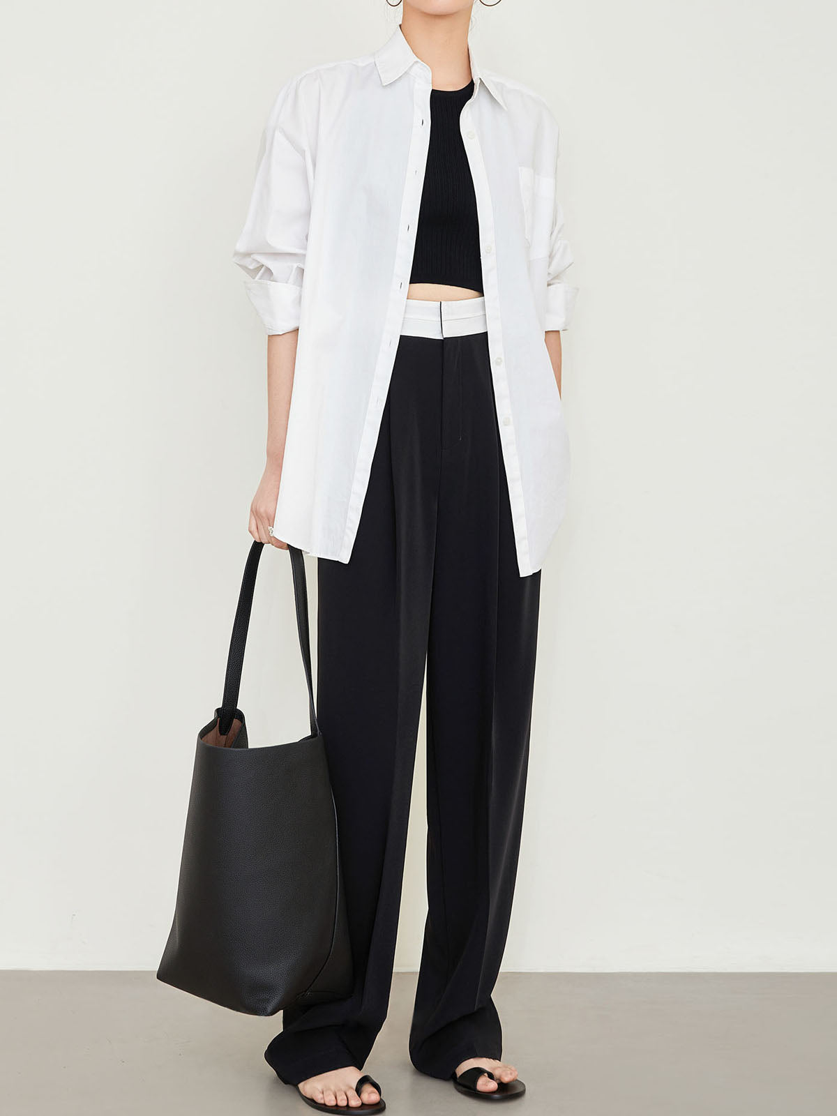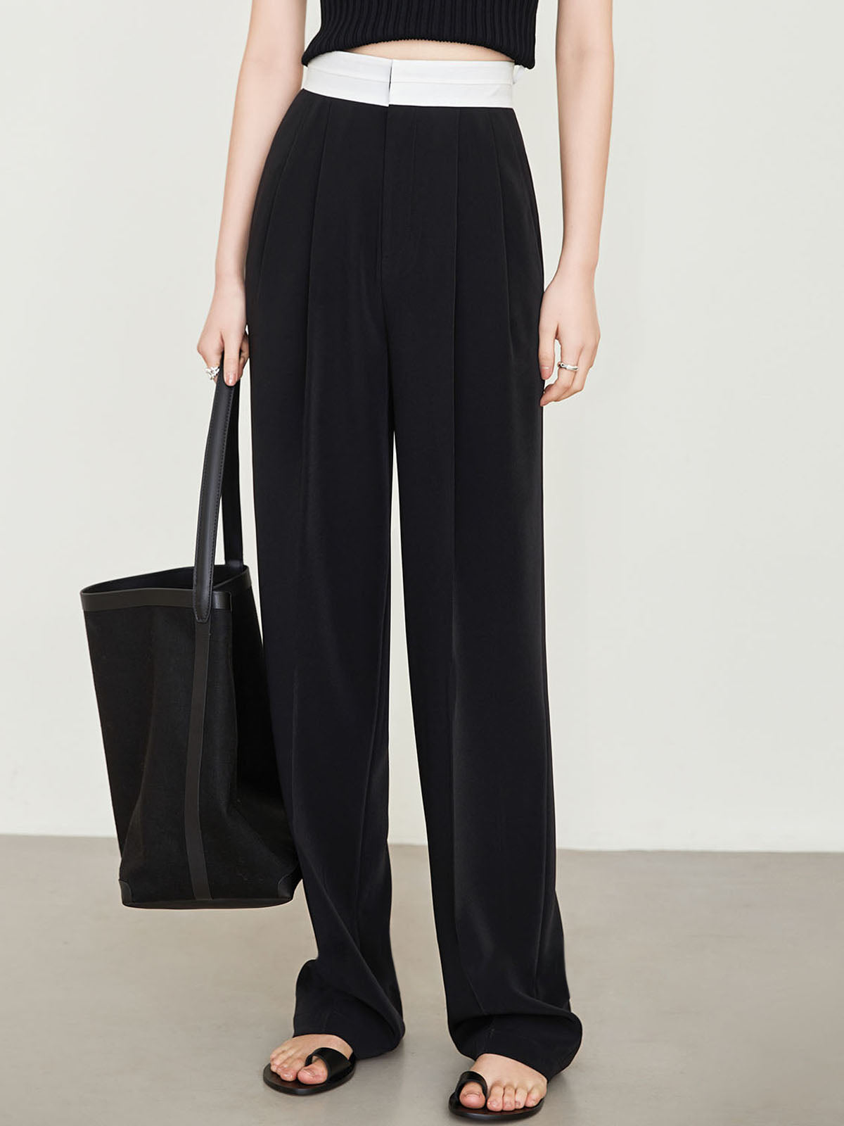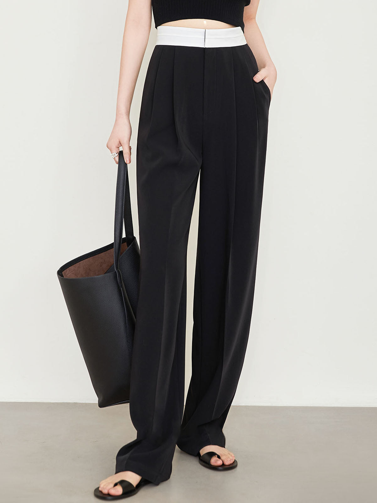 Contrast Waistband Pleated Full Length Wide Leg Pants