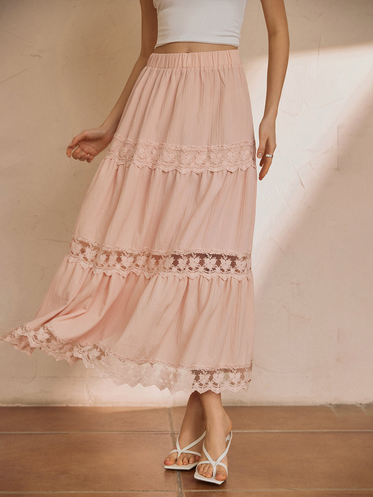 Cotton Blends Lace Trim Maxi Skirt