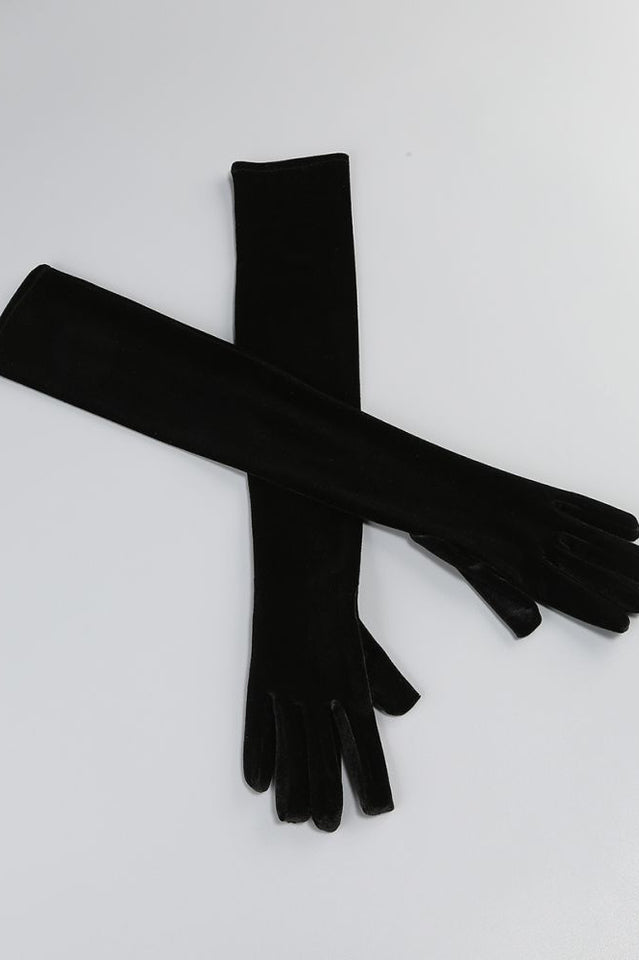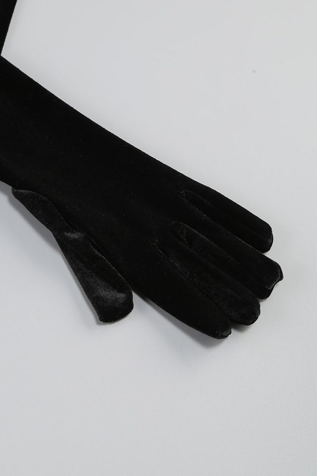Cupid Dress has a clean strapless neckline perfectly balanced with a straight hem and princess seams. finished in a Black Crepe. This dress is fully lined and comes with matching long opera Gloves that are unlined with an invisible zip also made from Black Crepe.