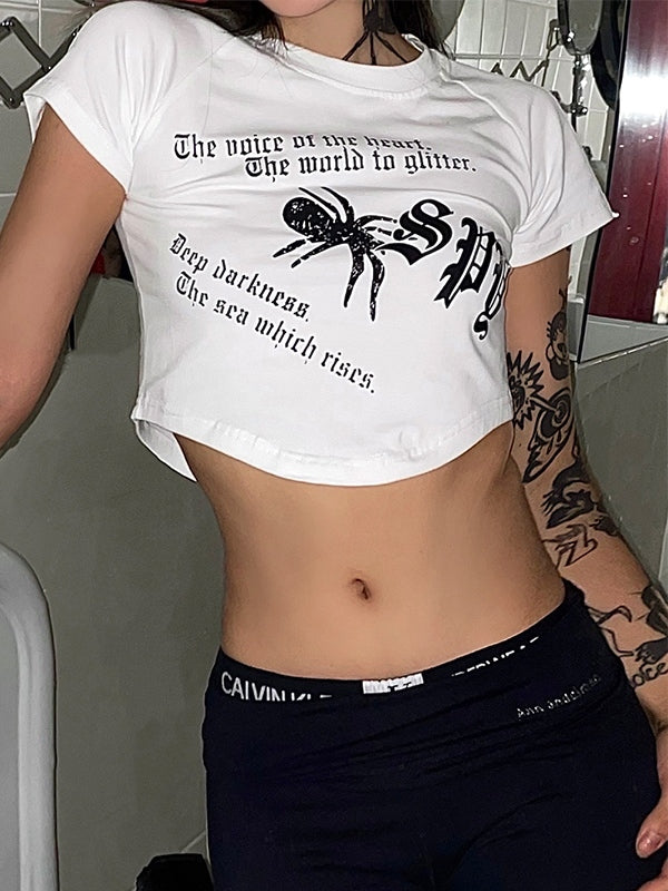 -With gothic-inspired letter and spider print design add a touch of edge and punk to the tops.