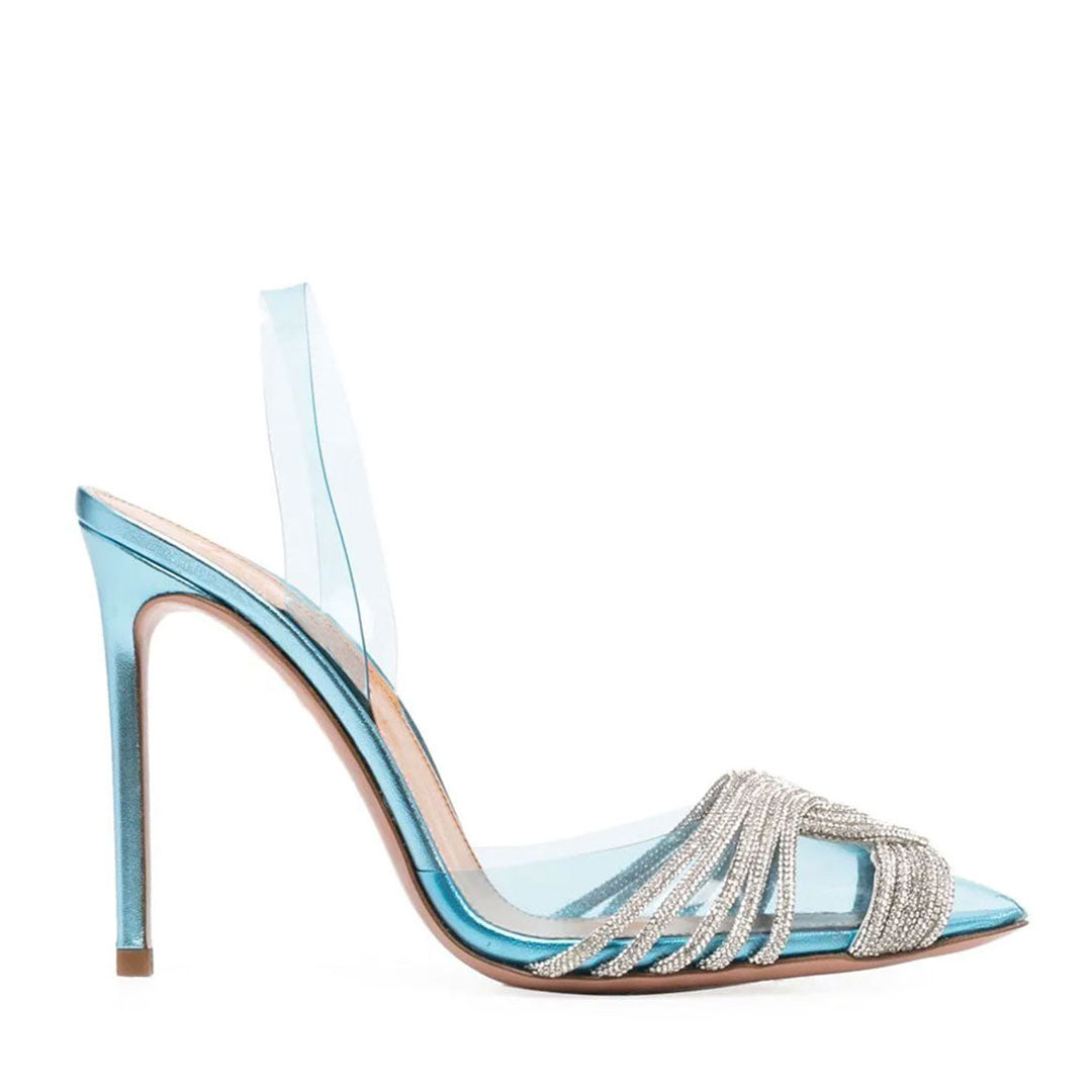 These glittering sandals will elevate the mood wherever you go. Crafted with faux leather. rubber and clear PVC. stand out in an exquisitely twisted upper adorned with crystal embellishments. featuring a pointy toe cap followed by a synthetic sole. a sandal styling tailored with a transparent slingback strap. a sleek high heel anchored by a rubber patch. Find more trendy women's pointed-toe pumps and unique shoes in our boutique. and try them on with a sparkly necklace and a pair of eyeglasses - Heel height: 11cm.