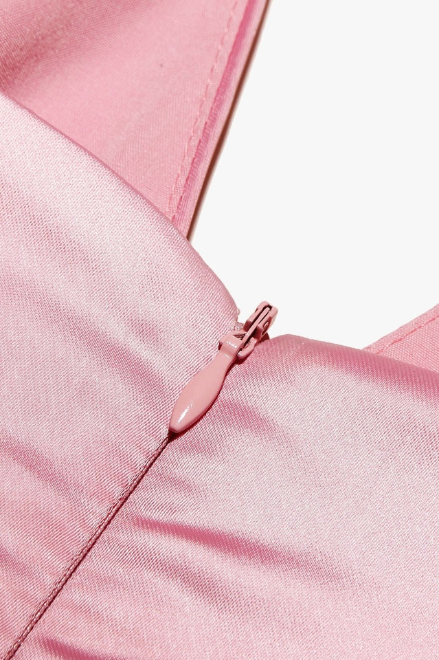 Deep V Neck Cinch Waist Satin Midi Dress is beautifully constructed from a heavyweight lustrous Duchess satin with a nod to elegant vintage silhouettes. This lady-like cut is defined by an ultra nipped waist extending out to a layered overskirt structured with tulle. The plunge neckline and pretty shoulder knots finish the elegant look.
