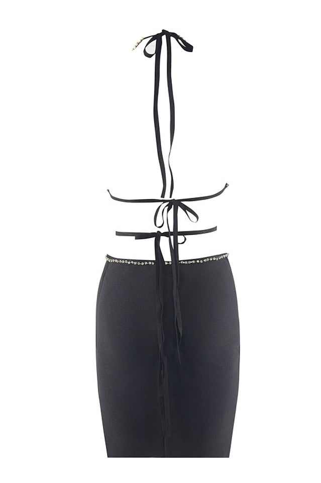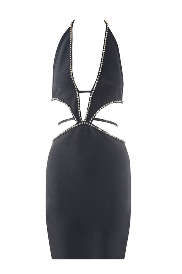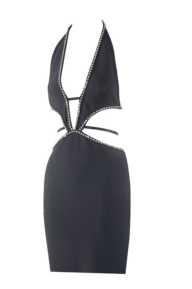 Make a style statement in the pristine Egypt Black Mini Dress. Crafted with an alluring halter strap and a deep v neckline. this dress is sure to turn heads. Luxurious black fabric is further adorned with sparkling rhinestones at the cutting area for an added touch of elegance. Perfect for a memorable night out.