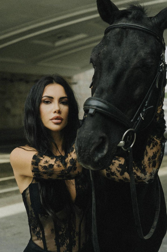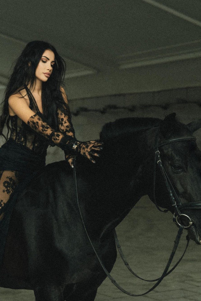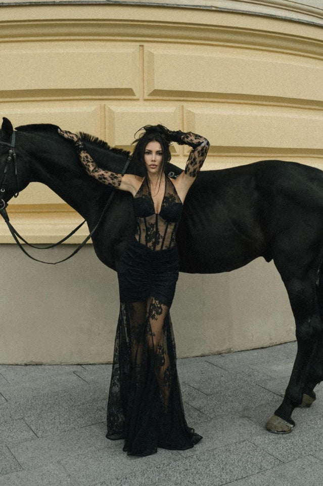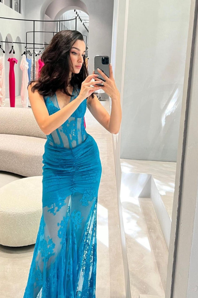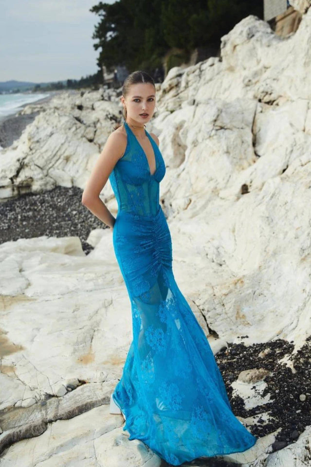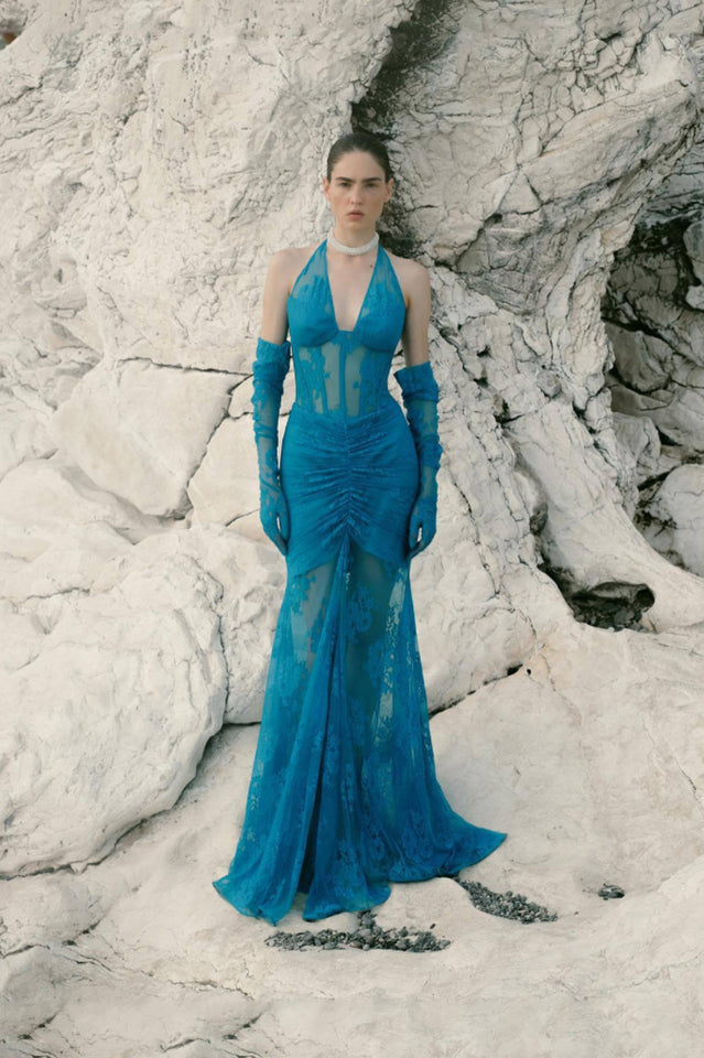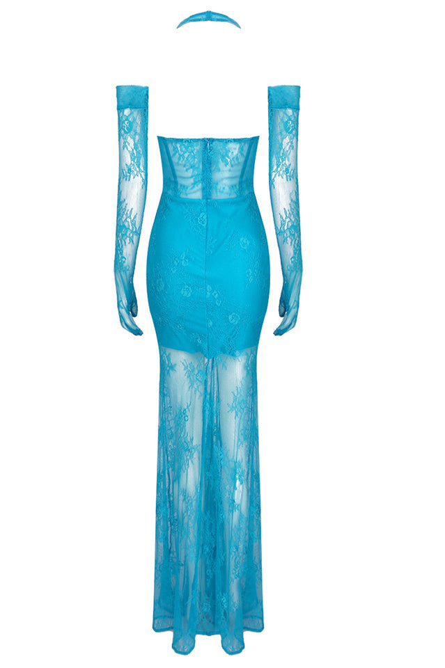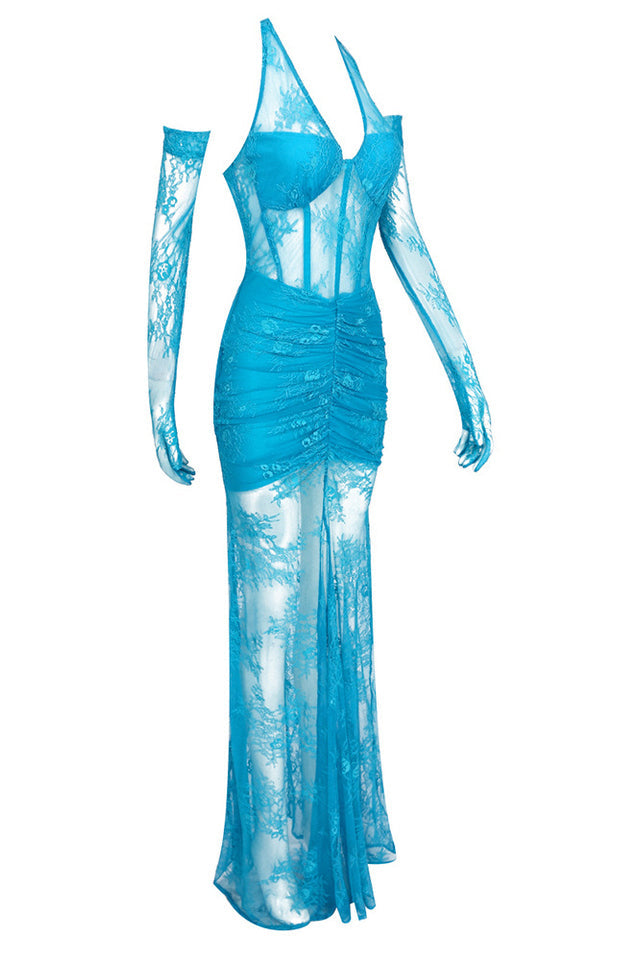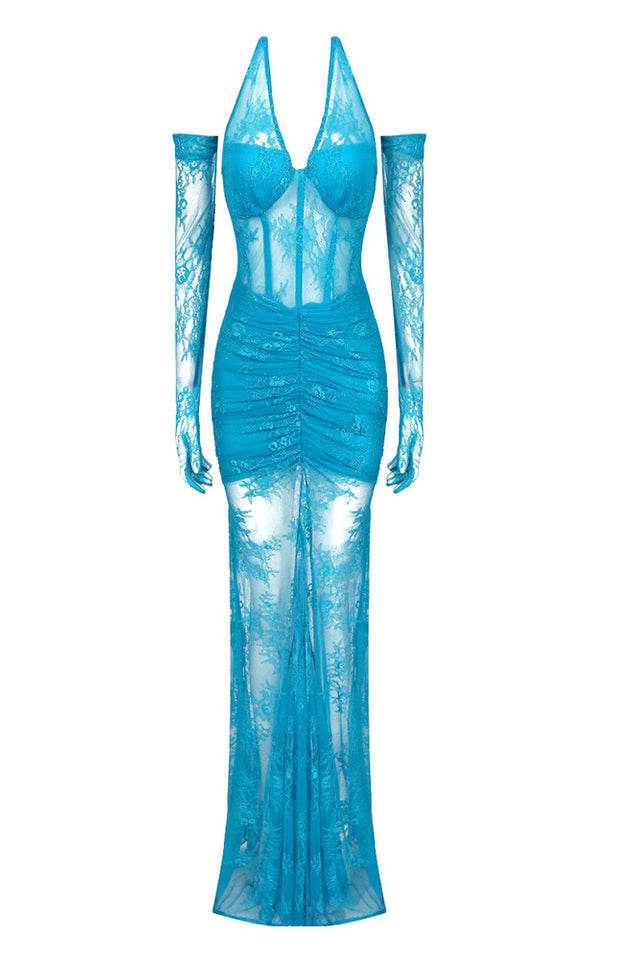 Dress With Gloves. Lace Design. Sleeveless. Halterneck Style. Maxi Length.
