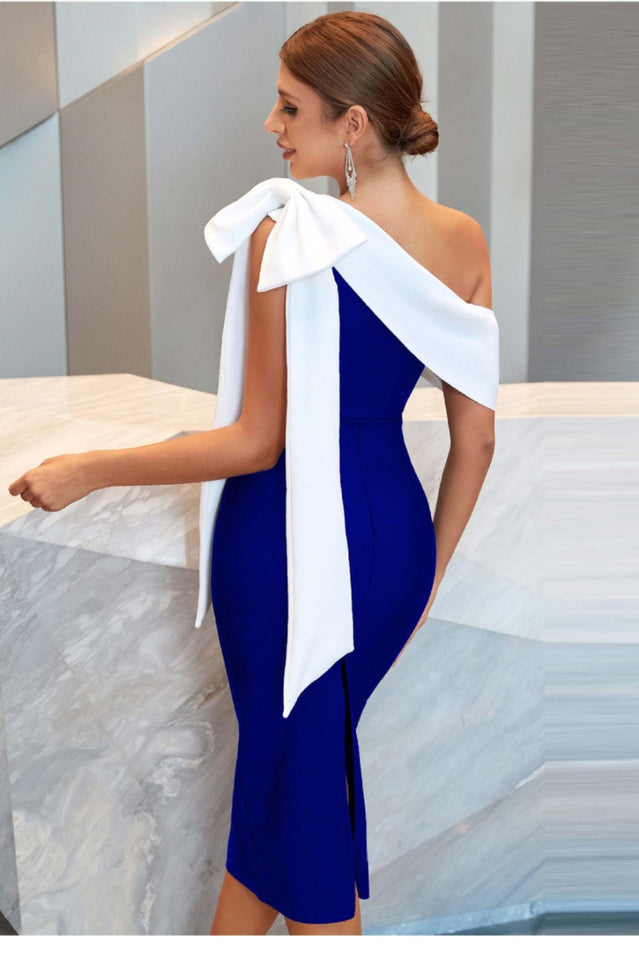 Elza Midi Bandage Dress is crafted from a thick and luxurious stretch bandage fabrication to cinch and stretch where you need. This one shoulder style features an accentuated white sash bow wrapped from décolletage to back with an inner invisible silicone non-slip trace. She is an extremely flattering fit with a back midi split and an invisible side zip to close. Valentina will give you that old school classic charm that never goes out of style.