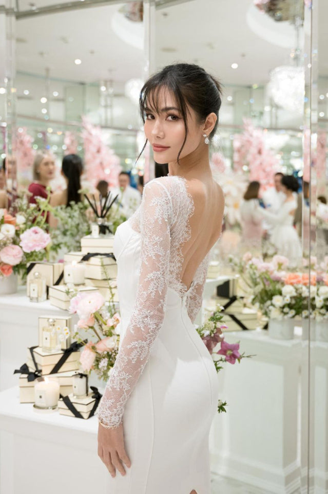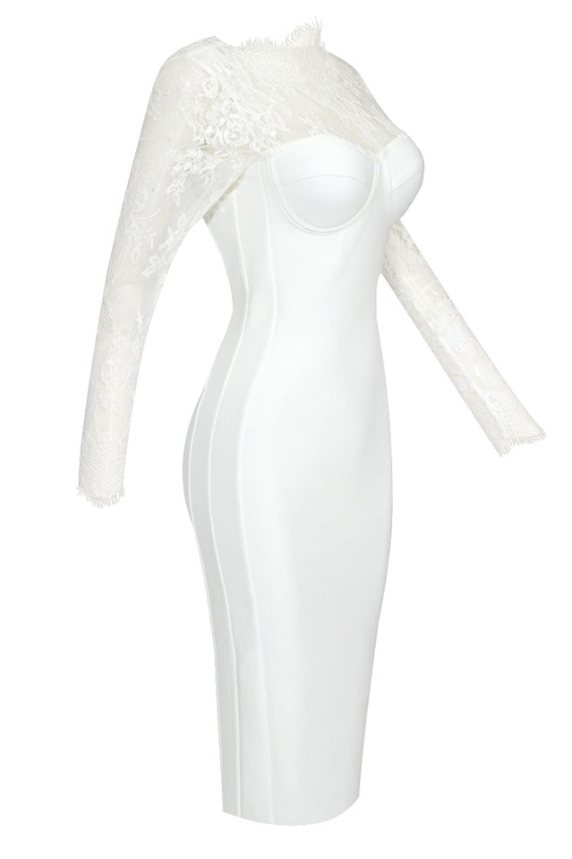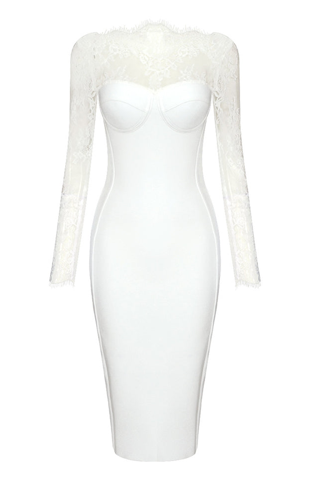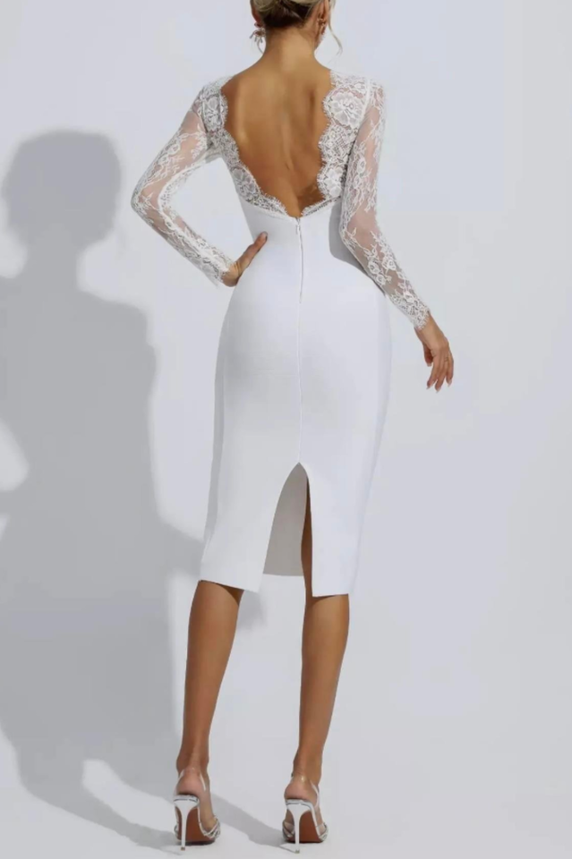 Romantic and feminine. this white lace midi dress is accented by ornate floral embroidery. The illusion neckline and long sheer sleeves provide coverage while still showcasing your décolletage. With a body-hugging fit to the knee. this is the perfect dress for cocktail parties and bridal showers.