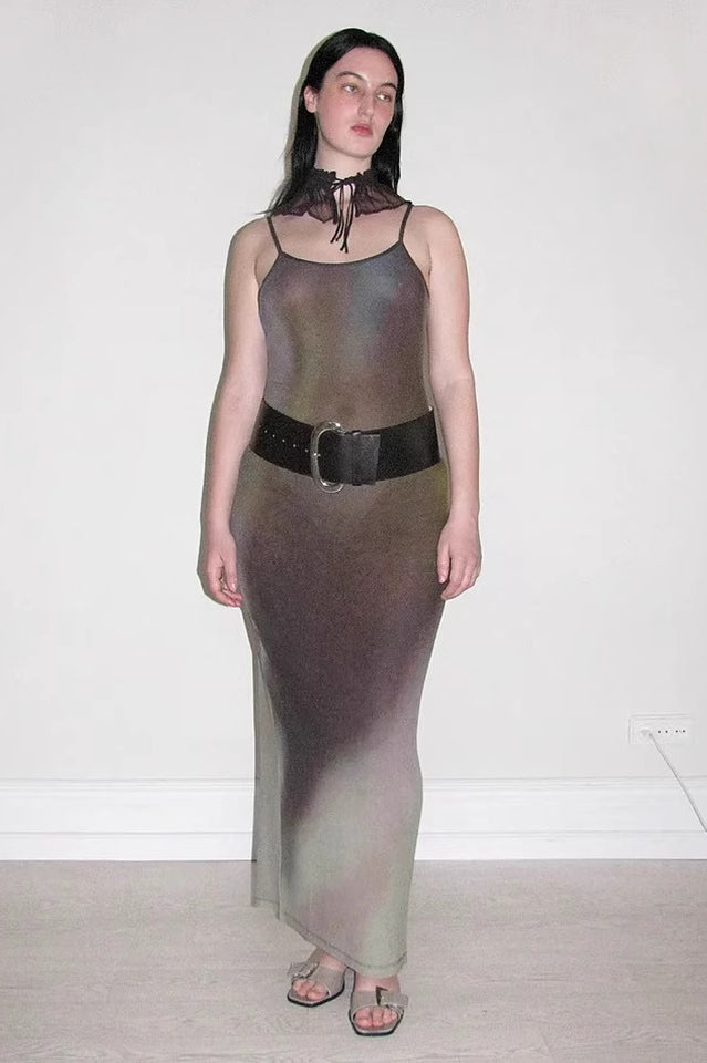 Ribbed strappy long dress featuring blurred flower digital print.