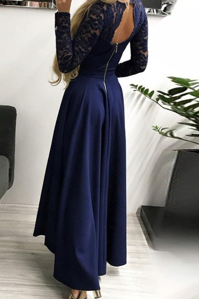 - Feature: Long Sleeve. V Neck. Floral Lace Crochet. Solid Color. High Low Hem. Maxi Gown Dress. Comfortable to Wear.