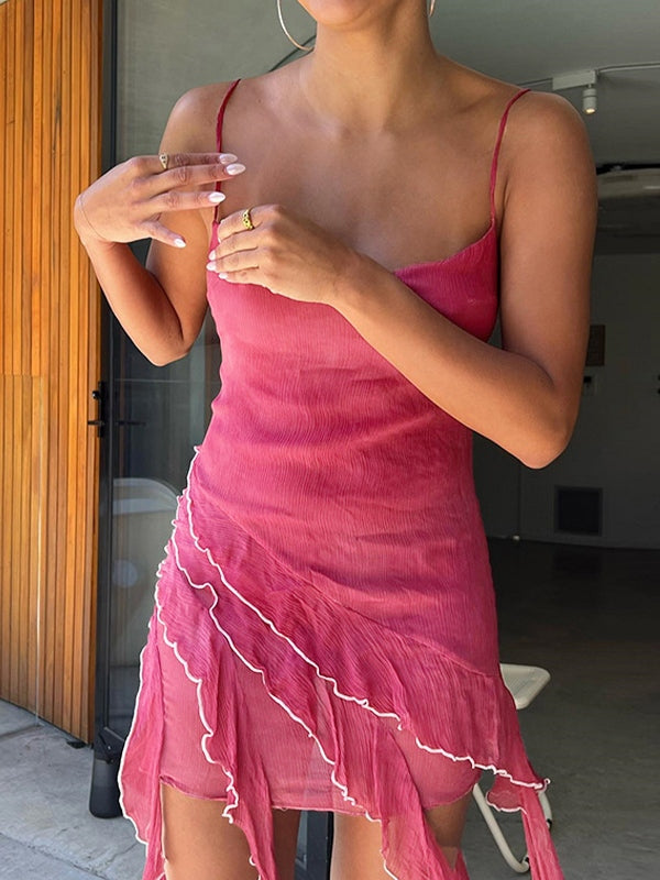 Description: This mini dress is made from stretch mesh fabric with fully lined design. shaped to a bodycon silhouette. it has an asymmetrical hemline. and features frill long strap details on the body.