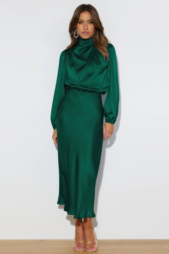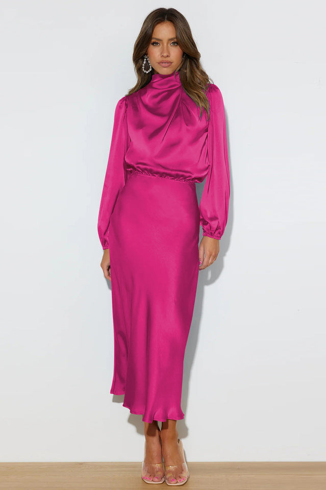 Make a statement in this FROM THE SOURCE High Neck Bridal Dress! This stunning satin dress will make waves as you walk down the aisle and beyond. Dare to be bold and defy expectations with this daring wedding guest style dress. Stand out!