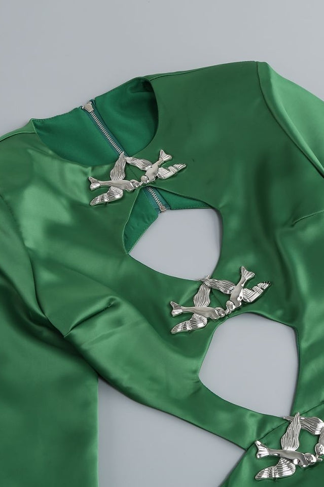 Sleek and modern. the Galla Mini Dress with Silver Birds lends a touch of graceful elegance to your wardrobe. Adorned with gorgeous silver birds. this ravishing dress features a satin effect. long sleeves. side cut-outs and a back zipper. making it the perfect choice for any special occasion. The stylish open back and mini length add a glamourous touch. ensuring you will make a statement in this luxurious piece.