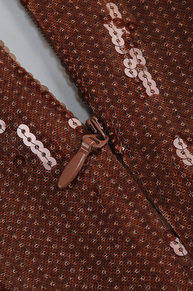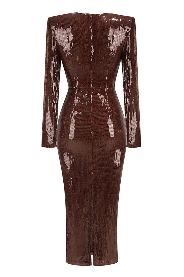 Gathered Sequined Midi Dress in Brown