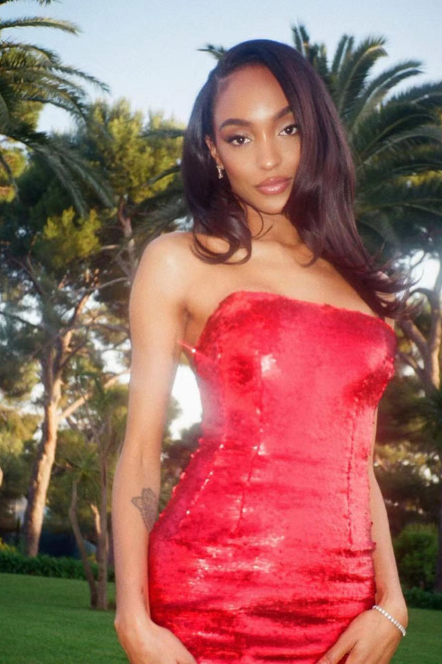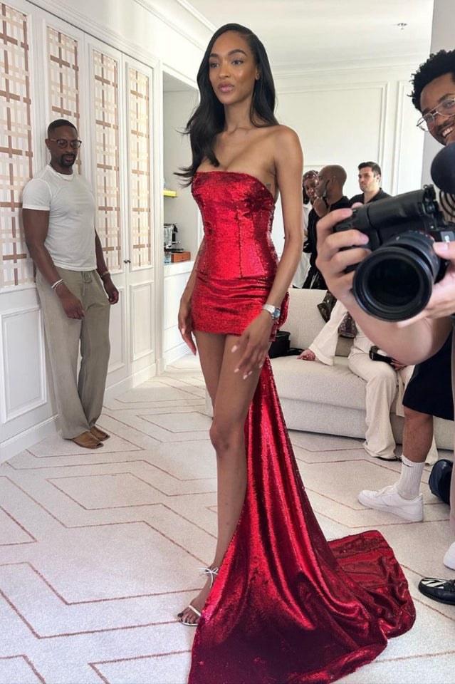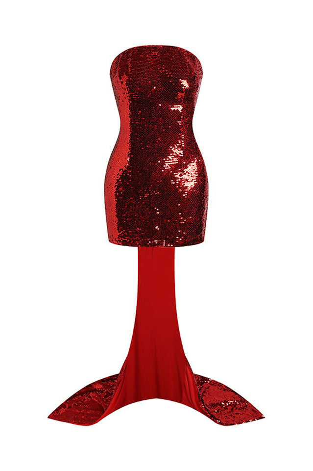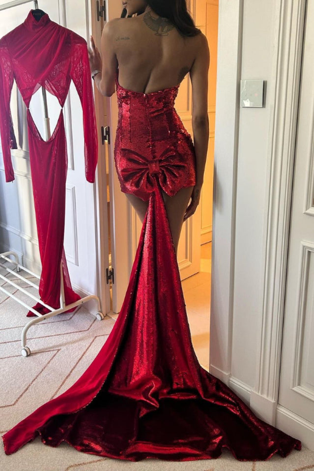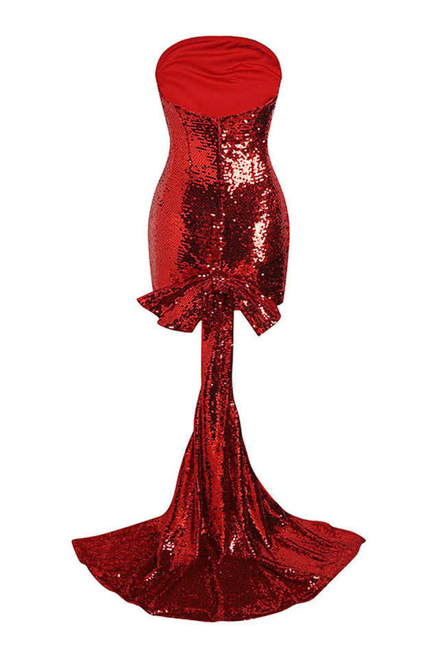 Own the Night in This Giselle Bow Tail Mini Dress. Covered Head to Toe in Shimmering Red Sequins! A Bodycon Fit Hugs Every Curve to Perfection. With a Short Hemline and Strapless Cut. This Dress Provides Ample Opportunity to Show Some Skin. Top It off With Your Highest Heels and Boldest Lip Color.