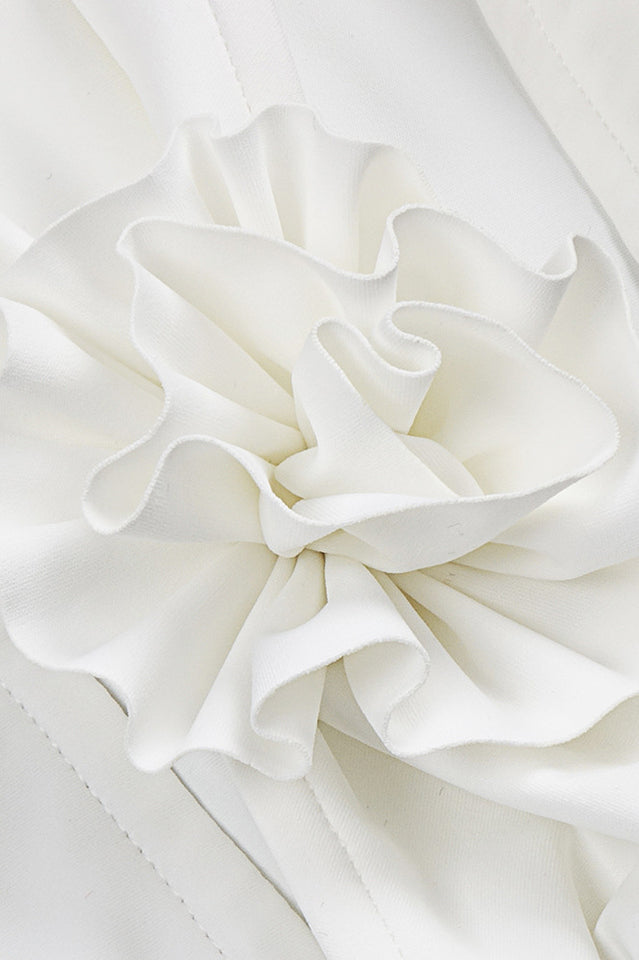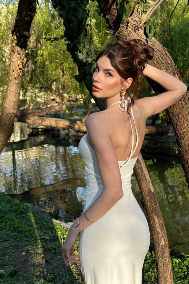 This elegant white maxi dress is a stunning choice for women seeking a fashionable gown outfit. It falls under the evening collection of dresses and is designed to enhance your style and confidence. With its halter tie around the neck. an open back. daring cutouts at the front with three vivid rosette flowers and ruching detail at the sides of the fitted bodice. and a floor-length dress cut. the glamorous maxi flower dress in our boutique is meticulously crafted to accentuate your curves in the right places. Whether it's a formal event or a special occasion. this sexy sleeveless dress is a must-have addition to your wardrobe.