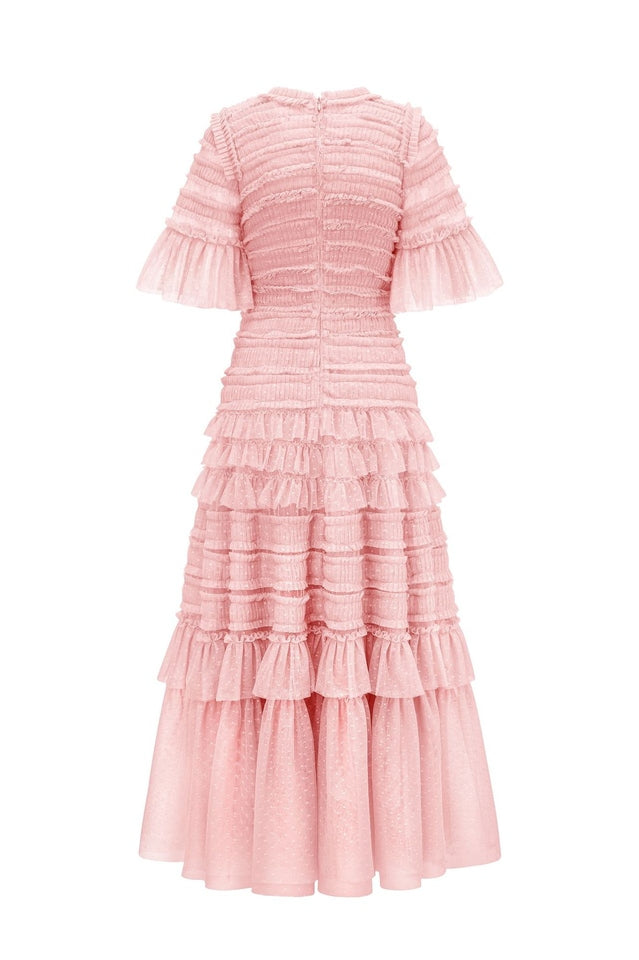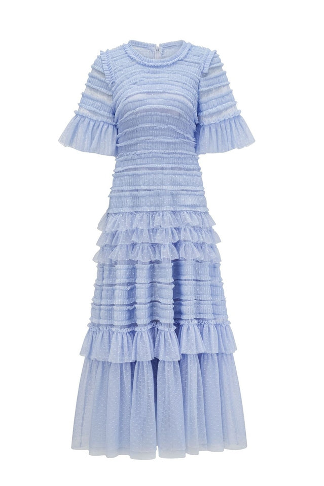 Channel the spirit of a serene. dreamy garden with our Harper Dress. This midi dress is designed with layered tulle ruffles and delicate polka dot detailing. encapsulating a whimsical yet structured silhouette.