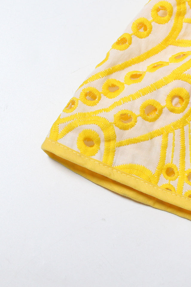 The pretty balconette neckline and the corseted bodice fit perfectly. falling into a beautiful asymmetrical skirt in the same openwork fabric. Combine it with some espadrilles and some striking jewelry.
