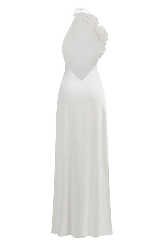 Floral Applique. Open V-back. Sleeveless. Halter Neck. Maxi Length.
