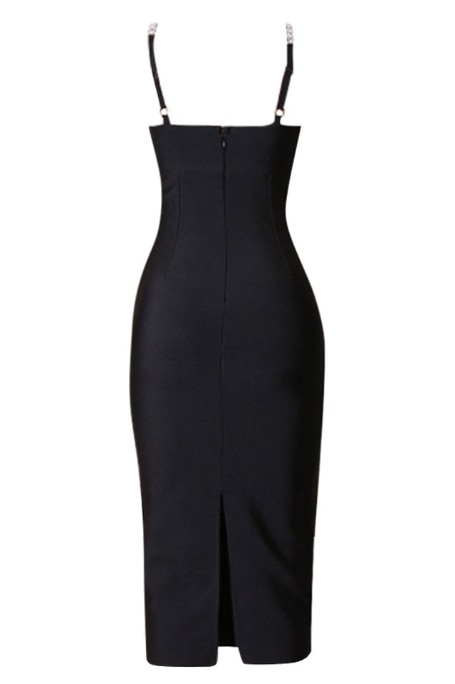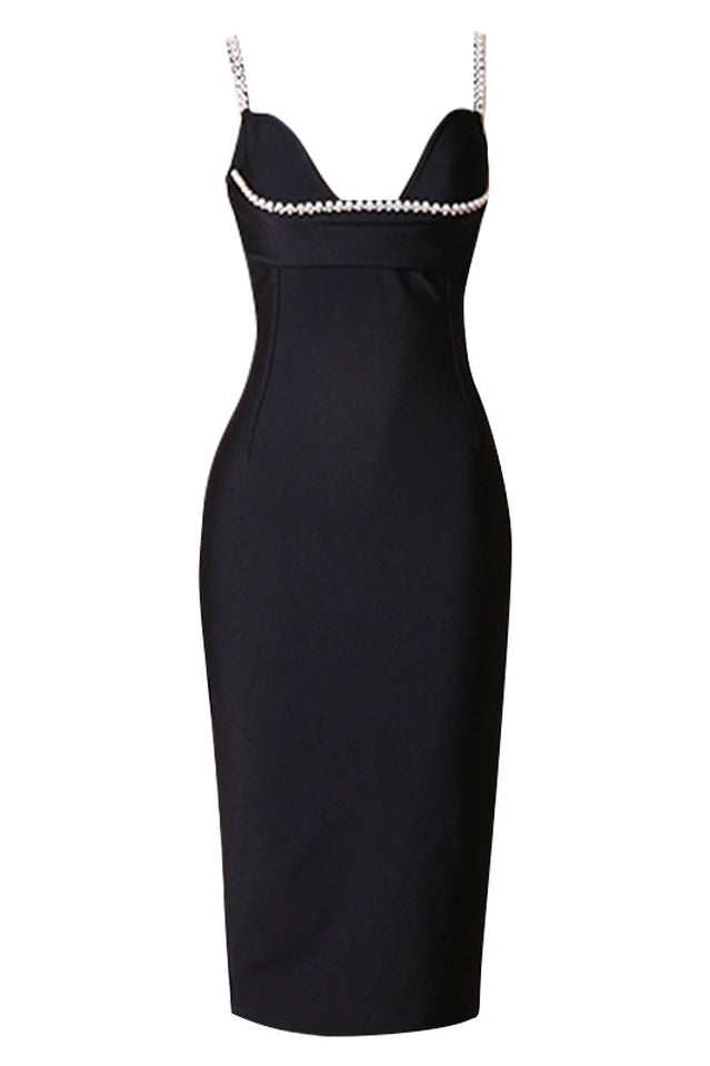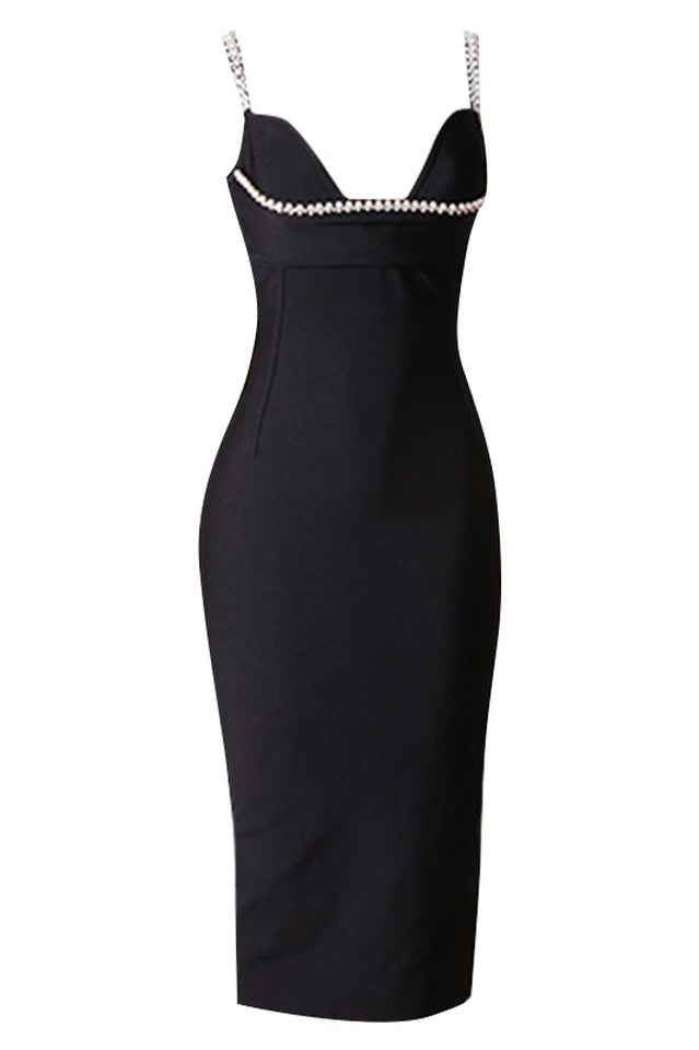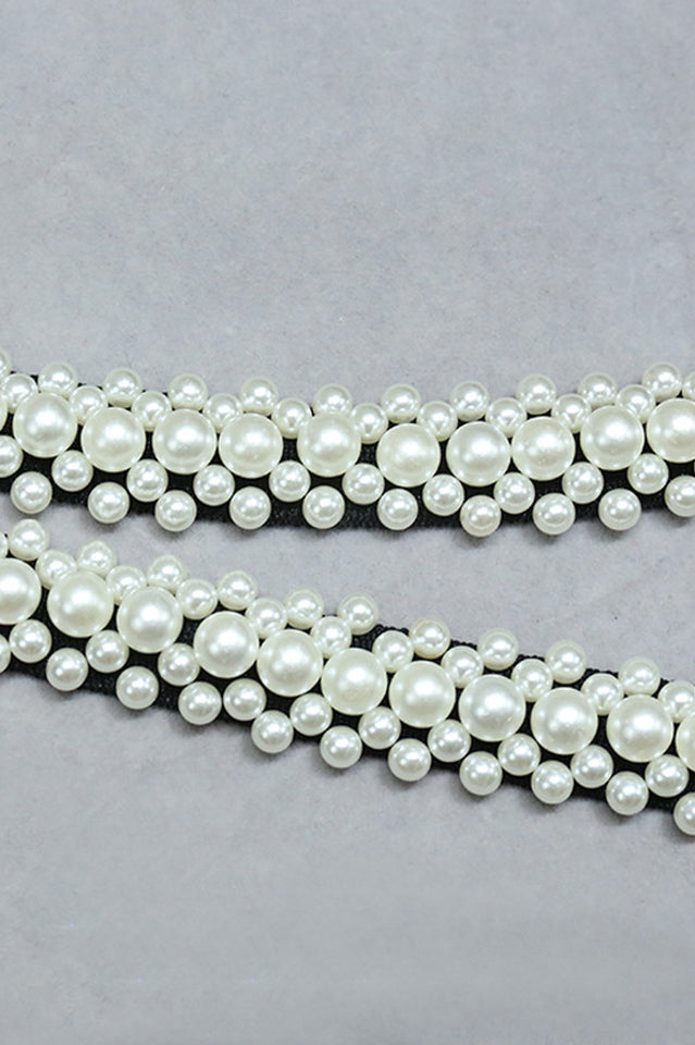 Want to wow the crowd at your event? Isla Pearl Sling Bandage Dress is just that special. The fabric is cut with high-quality luxurious stretch bandages for charming detailing that shines effortlessly. Delicate small pearls adorn the suspenders and also drop on the chest. All you need is a pair of apparent earrings and the right pair of heels to complete the look.