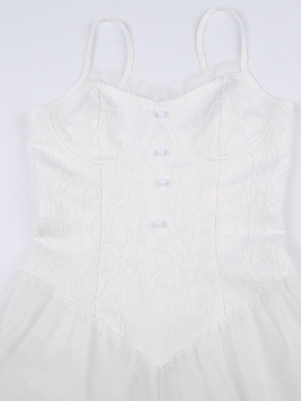 Description: These such cute & playful mini dress features adjustable shoulder straps. frill trim on the collar. it has a mesh paneled hem with lining design. faux pearl button embellished on the front. and fastened a concealed zip fly on the back.