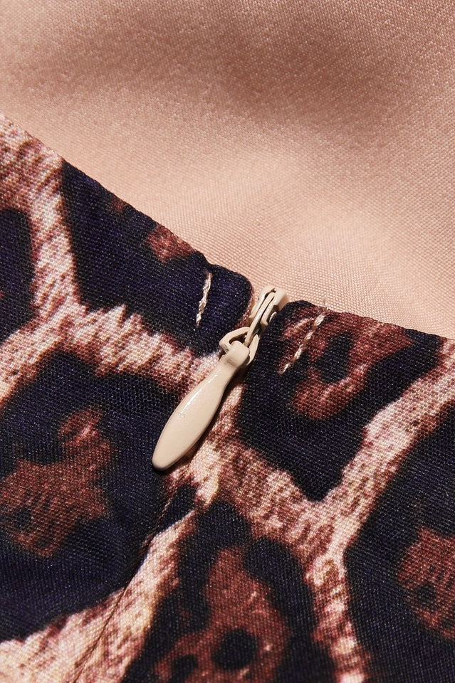 Crafted with stretch crepe. the Jacqueline mini dress is a stunning. bold statement piece designed to captivate attention. This backless mini dress features elegant cap sleeves and a sophisticated turtleneck neckline. creating a striking balance between playful and refined. The dress showcases a daring cheetah print that exudes confidence and energy.