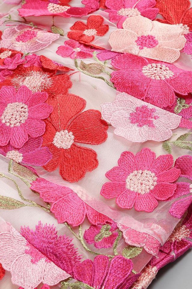 Mesh fabric with all-over floral appliqués and boned flared hem