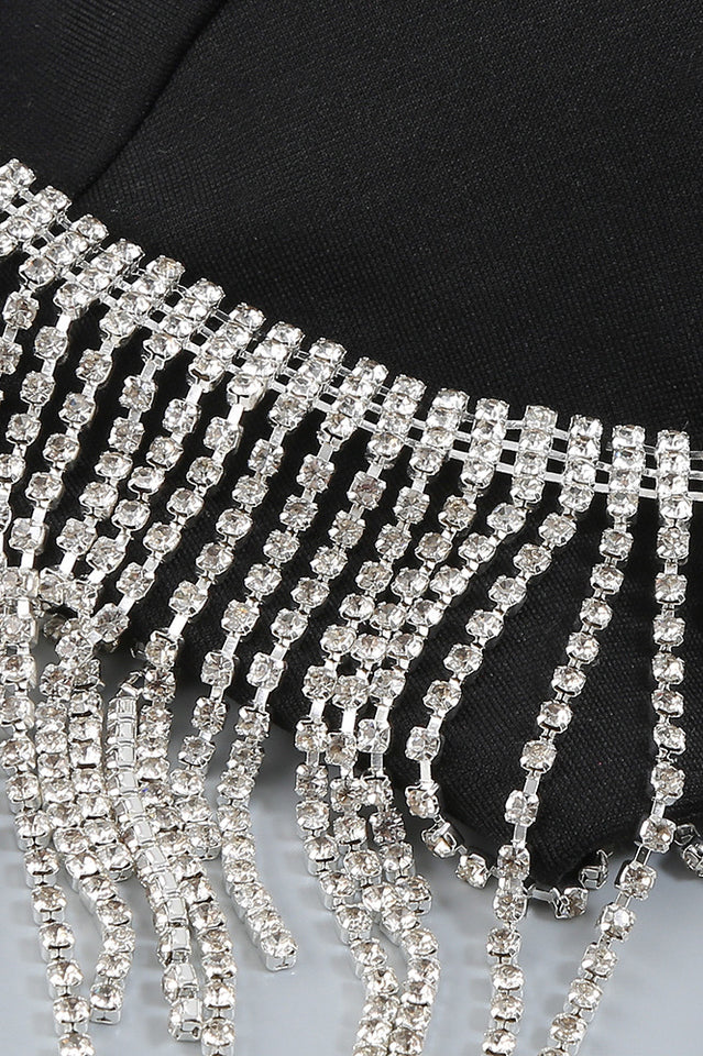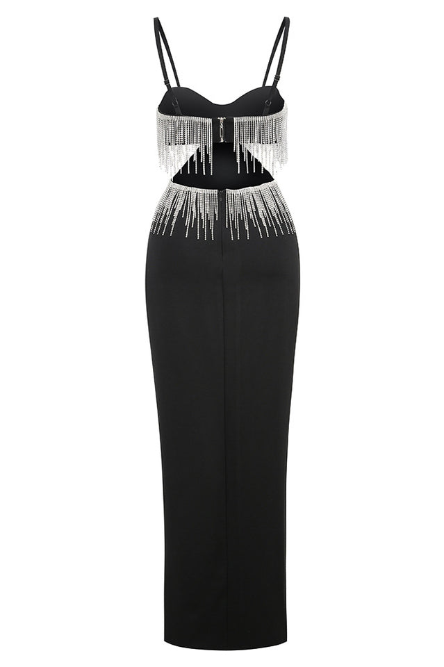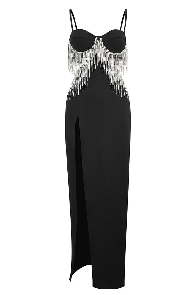 Classy. sultry and chic. the Keturah Crystal Fringe-Embellished Midi Dress has it all! This stunner showcases a romantic sweetheart neck that's supported by spaghetti shoulder straps. Bodice is complemented with side cutouts that go all the way to the back. continuing down into a hip-hugging midi skirt that is finished with a sexy thigh-high slit. Crystal fringe embellishment dazzles up the look!