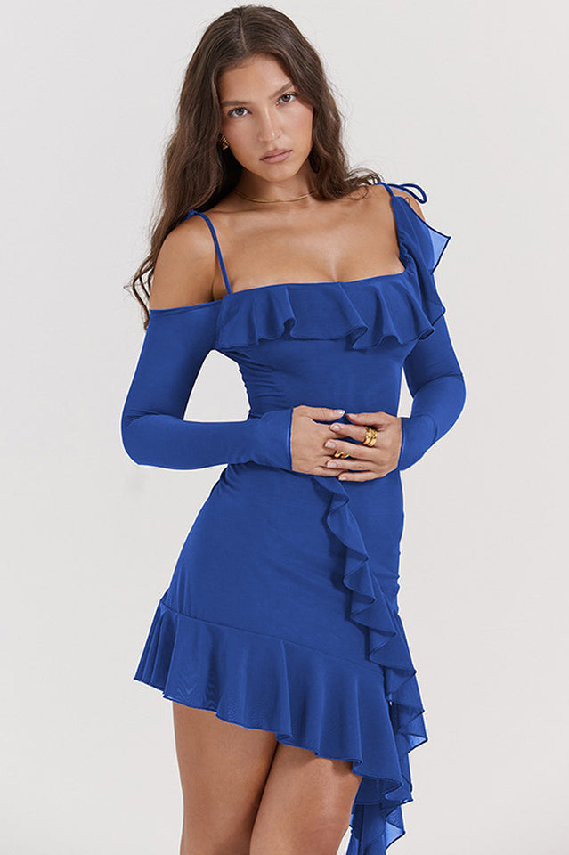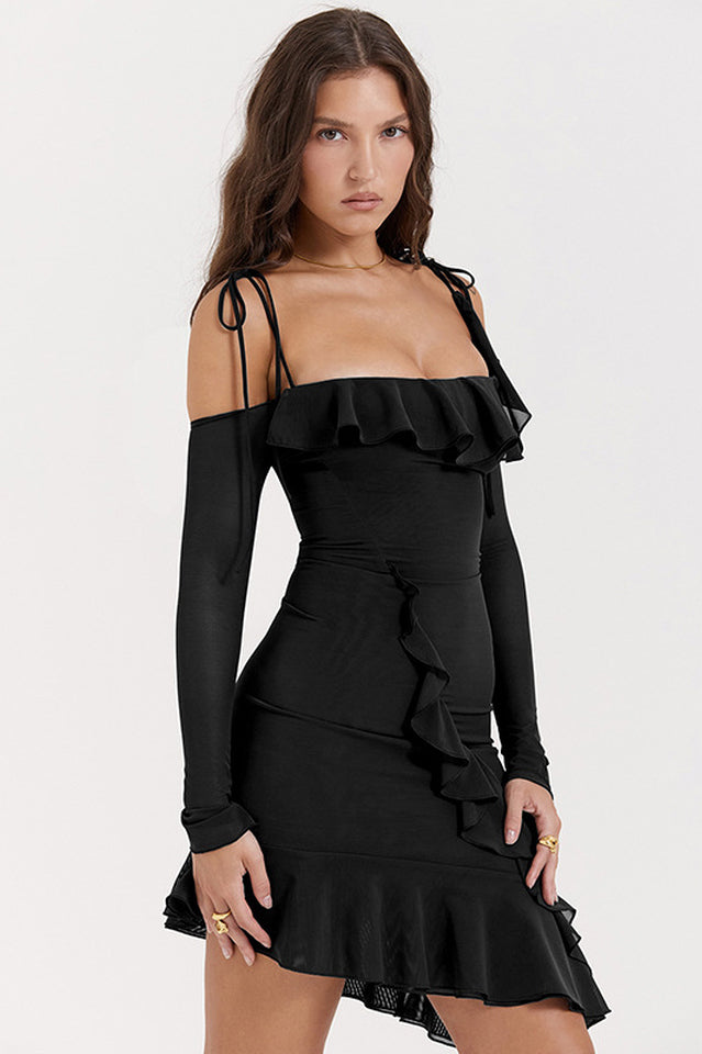 Beautifully cut from our figure cinching power mesh that hugs your curves perfectly. our Kiki Ruffle Mini Dress has so many pretty details. It's suspended from pin thin self tie straps and flattering long sleeves.