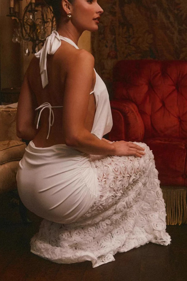Elevate your evening allure with the Kita Textured Maxi Dress. Featuring a dramatic deep cowl open neckline. ruched panel at the waist. and a captivating open back. it's designed for those who revel in the magic of moonlit nights and twilight's embrace.