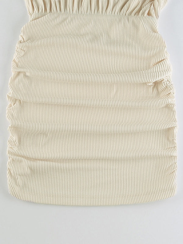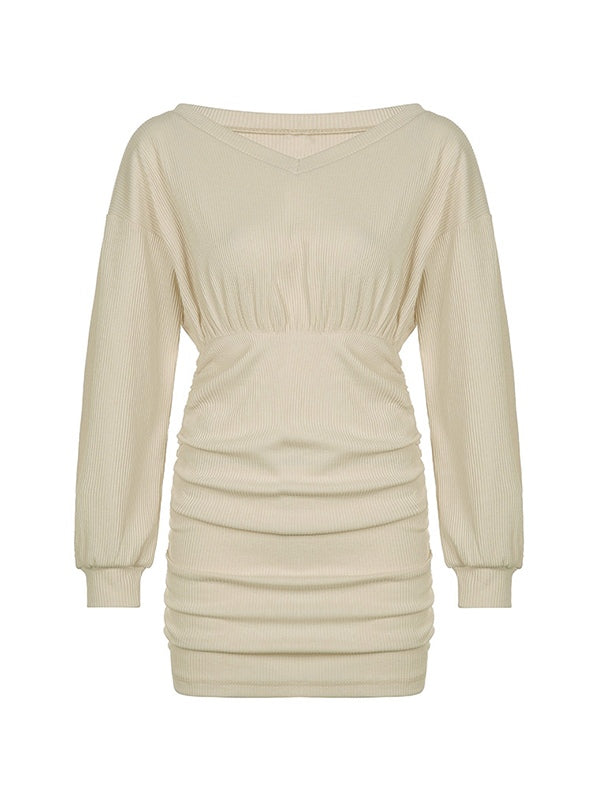 Description: This sweet & elegant dress crafted from cotton knit fabric. cuts to a fitted silhouette. features a cinch waist. with ruched detail and dropped long sleeves design.