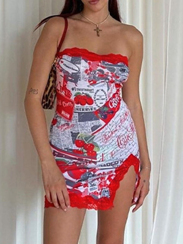 Description: This such cute bodycon dress has newspaper & fruit inspired print allover the body. it features a bandeau neck style. with lace paneled trims. and has split design on the hem.