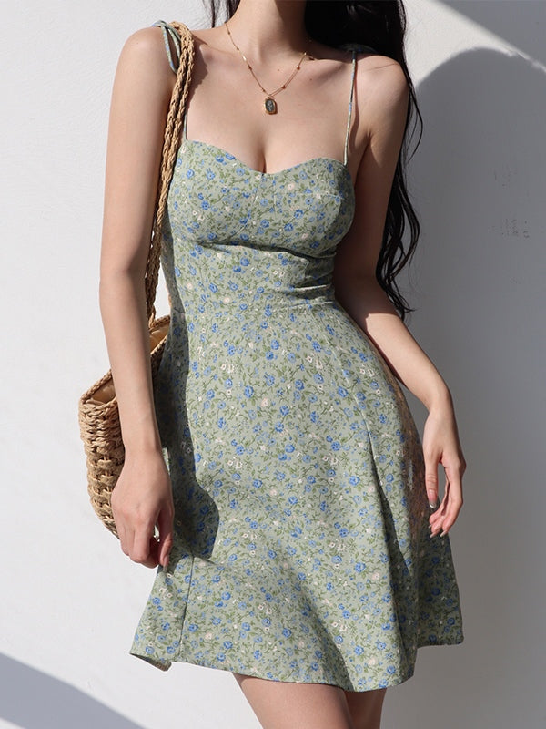 Lace Up Floral Green Mini Dress