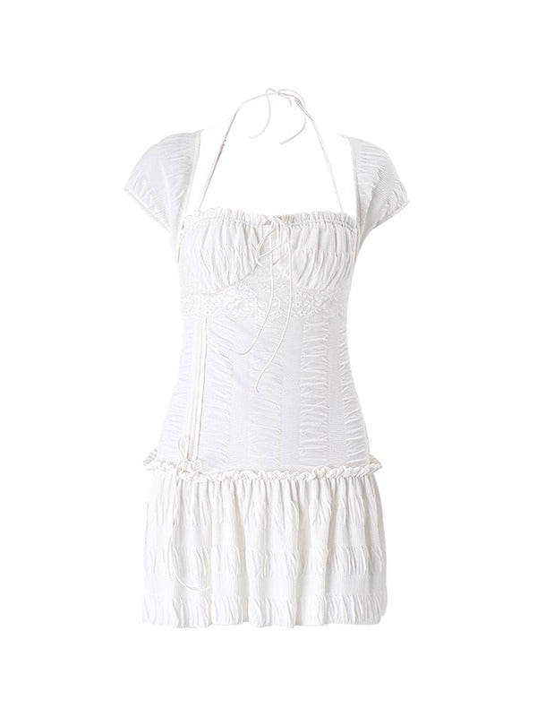 Description: This cute dress shaped to a bodycon fit. features short tank sleeves. frill edges. drawstring tie strap detailing. with lace paneled under the bust and ruched design.