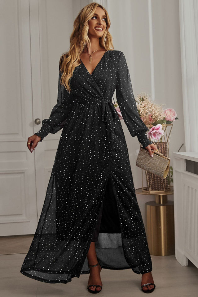 - Feature: Shimmer detail. V-Neckline. Maxi length. Waist Tie. Front slit.