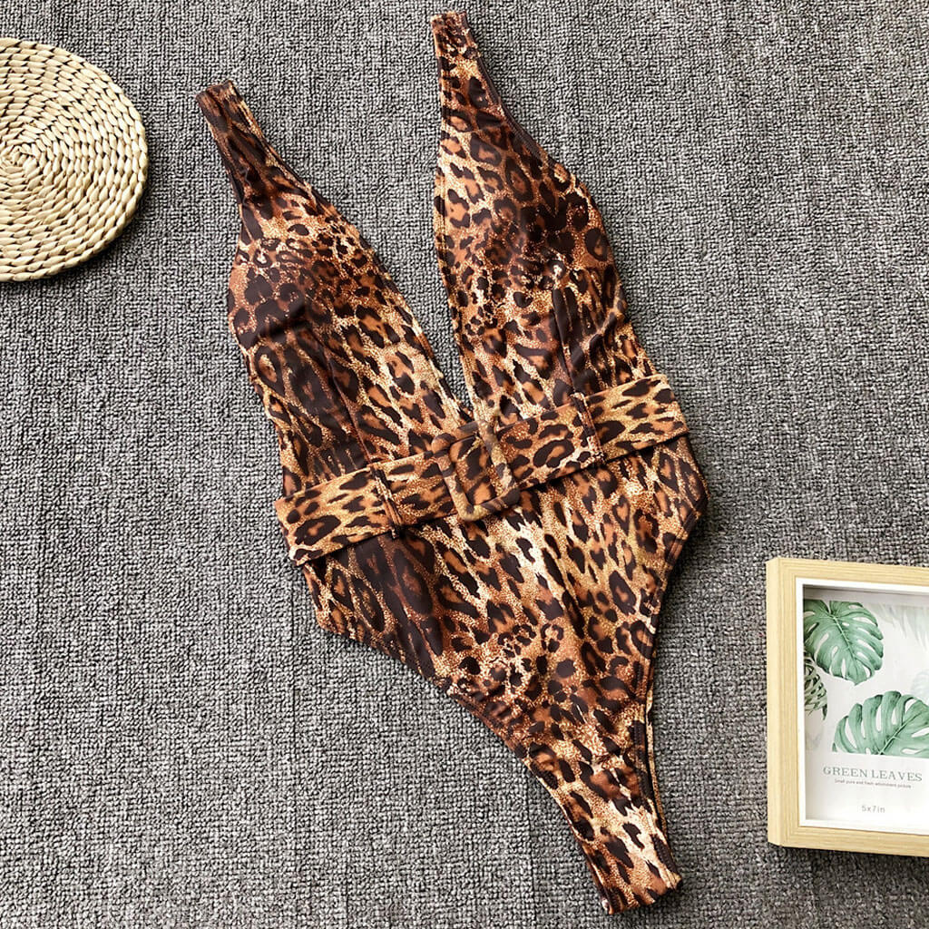 Leopard Printed Belted Deep V Neck High Cut One Piece Swimsuit - Coffee